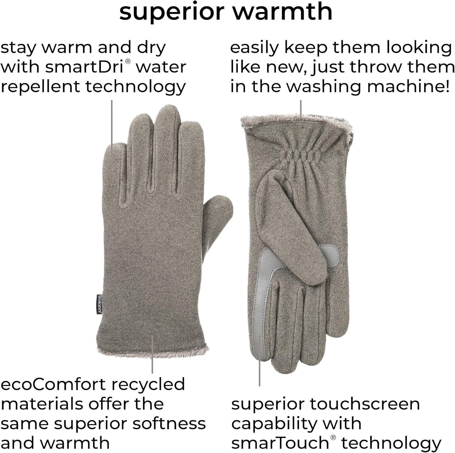 The ultimate custom fit and sophisticated style. isotoner Women’s Stretch Fleece Gloves contour for a custom fit and superior flexibility. Soft fleece provides cozy warmth, while the microluxe lining is supremely warm and silky soft for luxurious comfort. Non slip palm detail ensures a secure grip, and SmarTouch technology is touchscreen compatible, so you can keep warm while you keep in touch.
