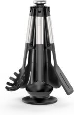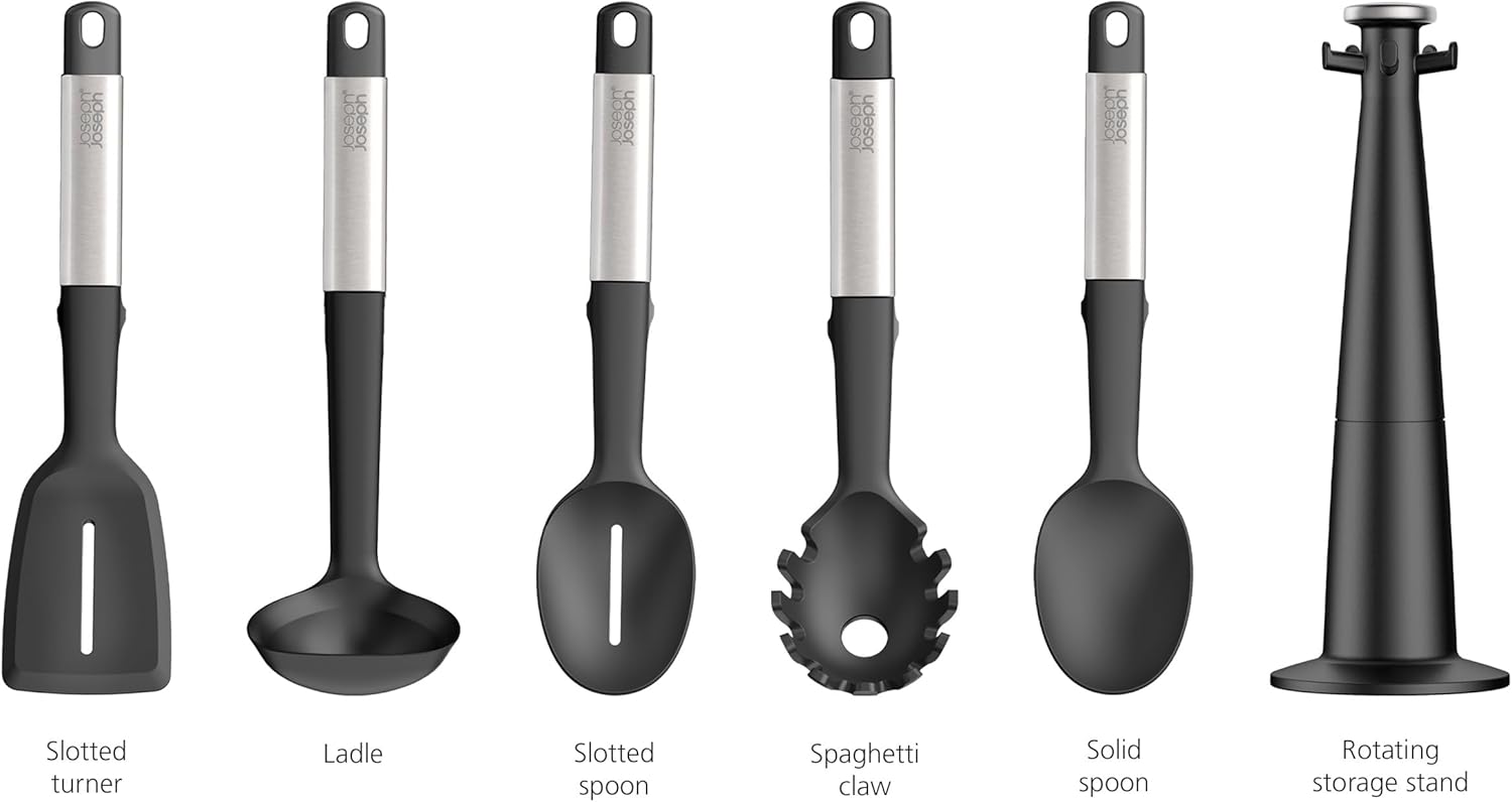 Set includes solid spoon, slotted spoon, slotted turner, spaghetti claw and ladle