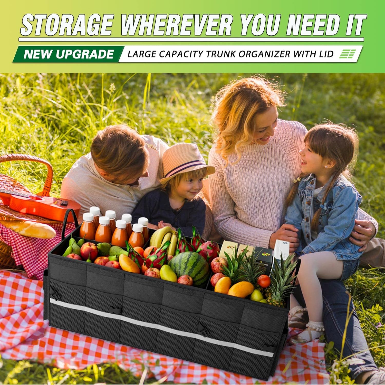 K KNODEL Car Trunk Organizer with Lid, 3 Compartments Collapsible Car Trunk Storage Organizer, Large Car Organizer and Storage for SUV, Truck, Sedan (Large, Black)