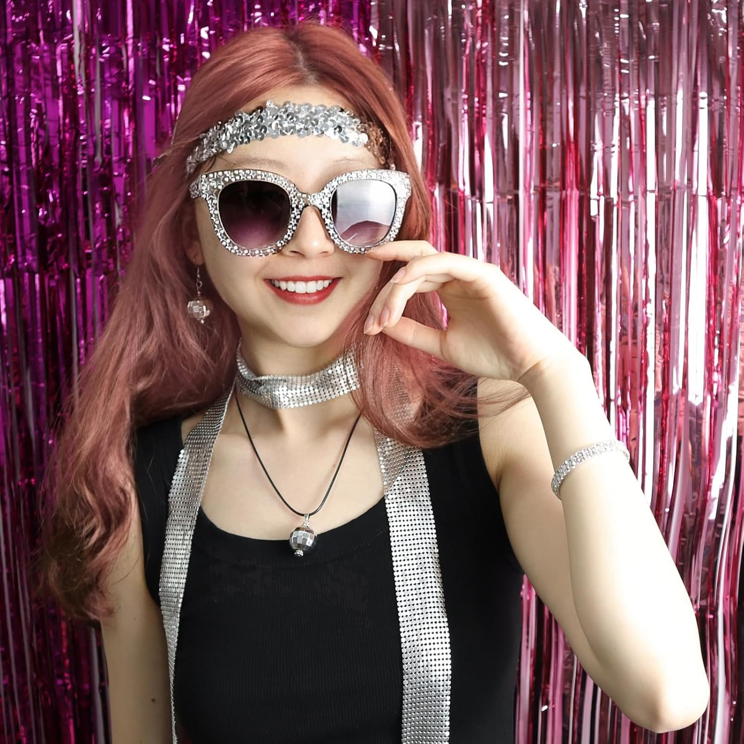 70s Women Disco Accessories Set – Sequin Scarf, Headband, Diamond Bracelet, Ball Necklace, Earring Glasses
