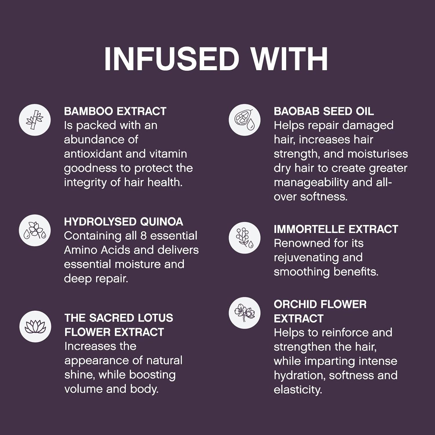 A deep conditioning restorative masque with a complex of 20 amino acids, quinoa and rice proteins, immortelle, lotus flower and baobab seed oils to renew youthful lustre to dry damaged or brittle hair.