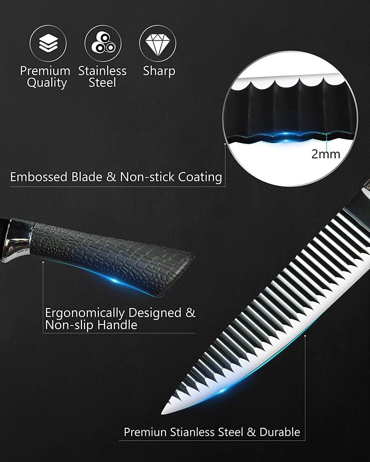 Non-Stick Coated Blades: Effortless cleaning and smooth cutting with scratch-resistant, non-stick stainless steel knives. Ergonomic Handles: Safe, sturdy, and comfortable handles for precision and control in every use.