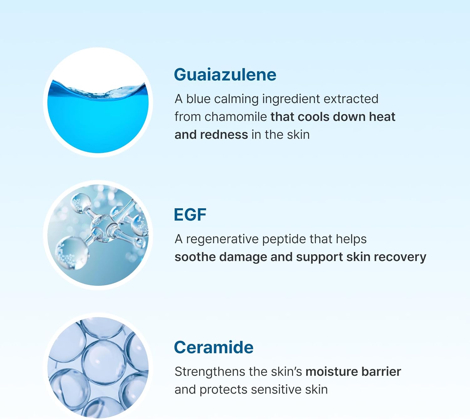 Guaiazulene, a natural component extracted from chamomile oil carries powerful skin calming abilities including calming inflammation of damaged skin tissue as well as regenerating new skin cells and is positively effective with sunburns, eczema, and ulcerative skin disease. Centella Asiatica, a plant native to Madagascar, also known as ‘tiger grass’ hydrates, relieves redness, helps in the regeneration of new skin cells and prevents scarring.
