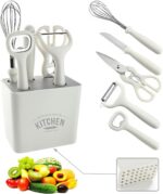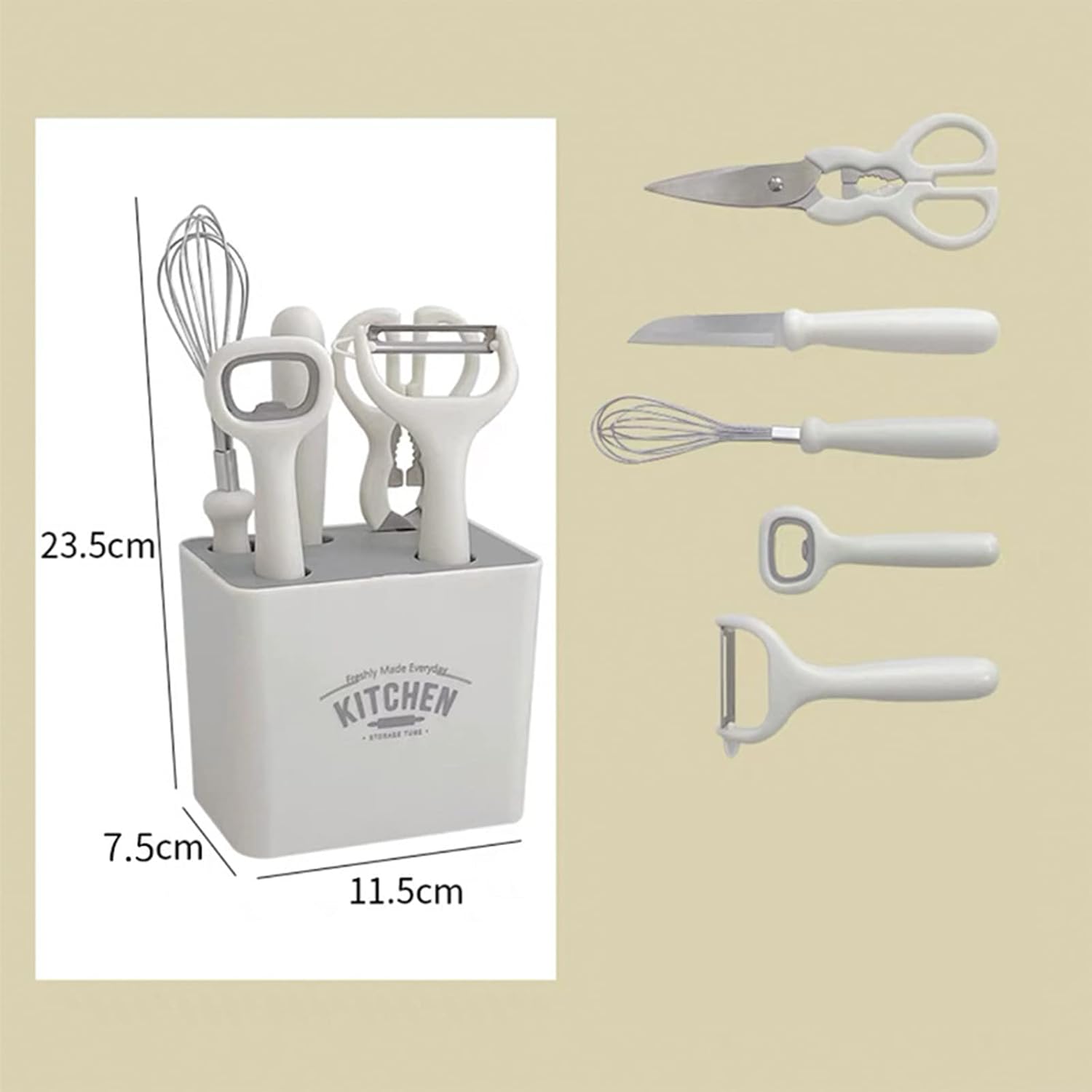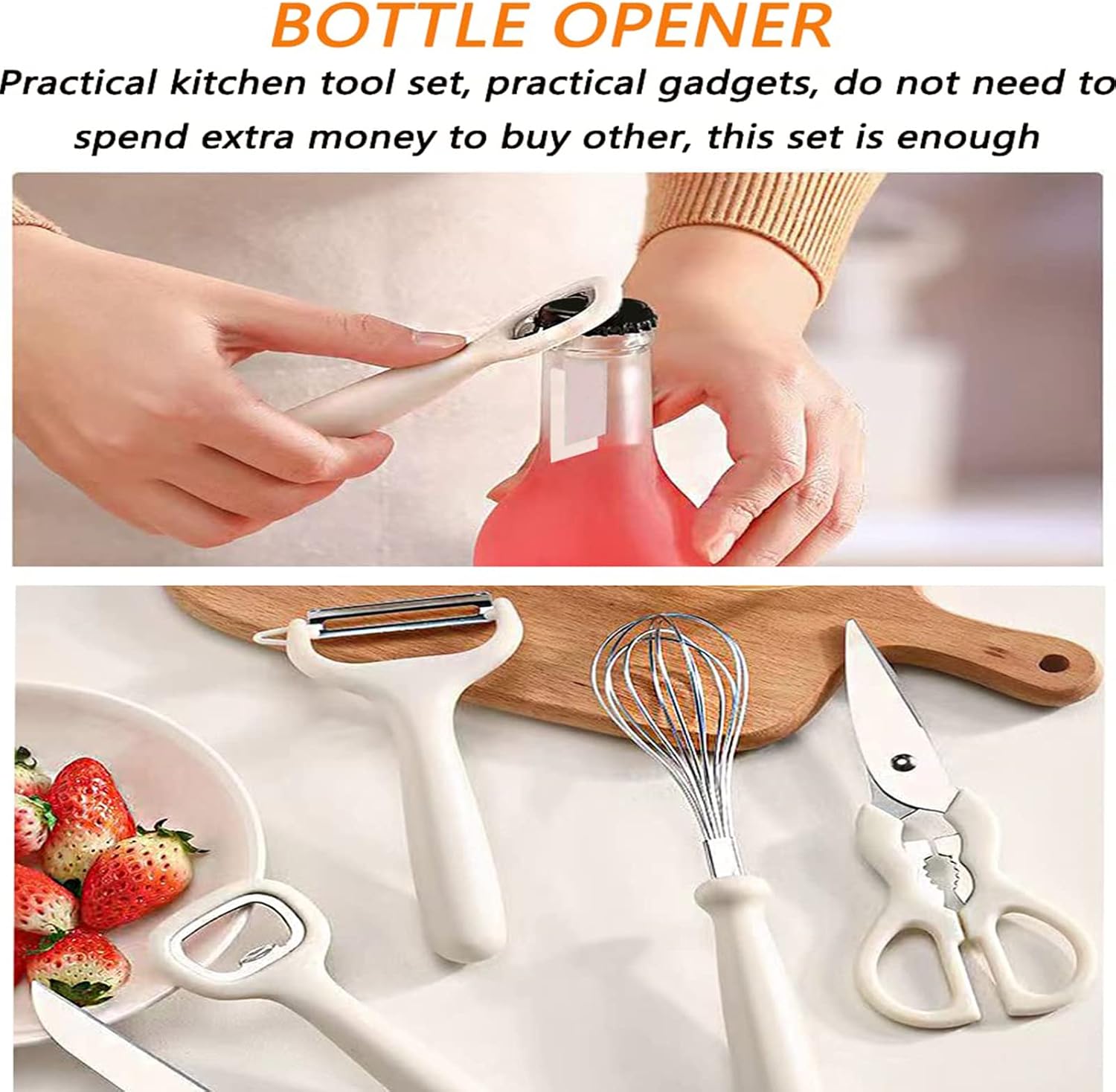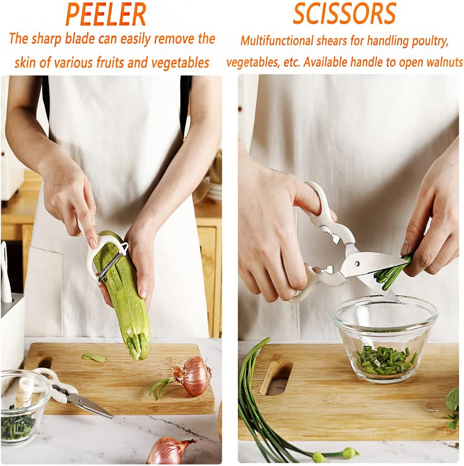 【6 in 1 Kitchen Peeler Set】 Our kitchen tools set contains; 1 vegetable and fruit peeler, 1 bottle opener, 1 fruit knife, 1 egg whisk, 1 vegetable scissors and 1 Standing storage base, a true gadget organizer makes kitchen life easy and tidy.