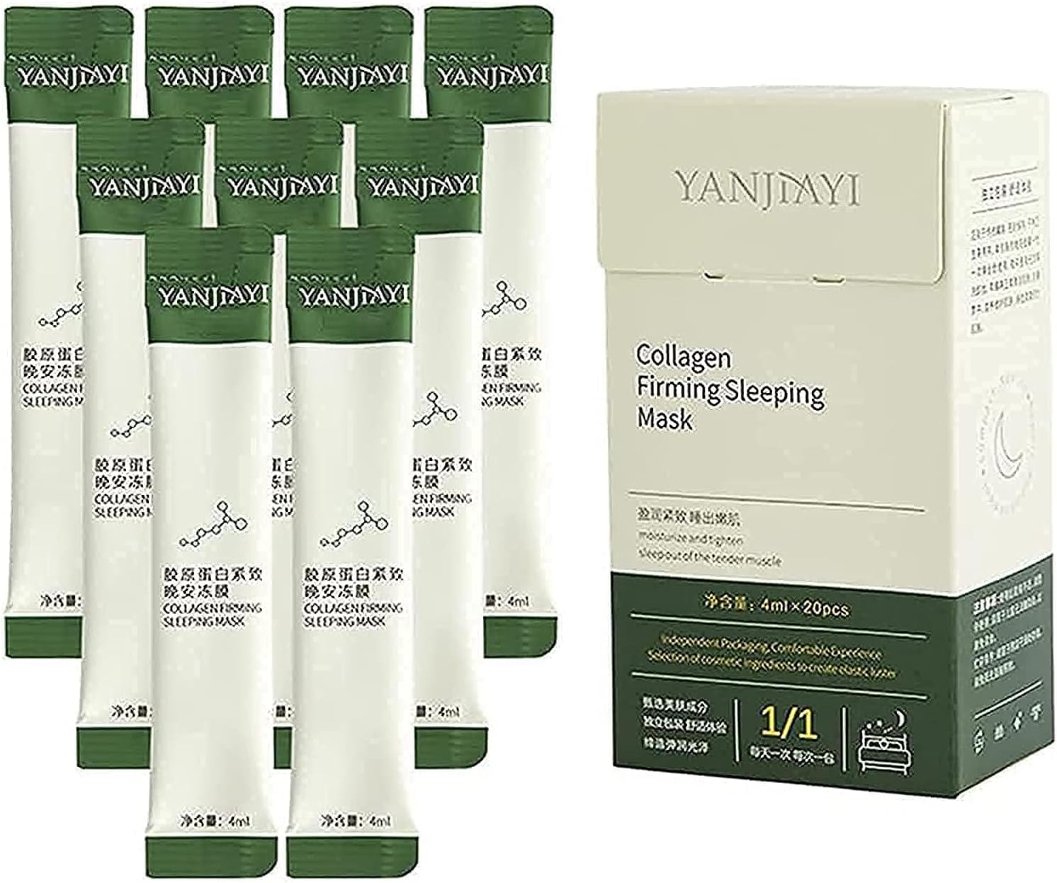 OIL & ALCOHOL FREE, NON-IRRITATING, FOR ALL SKIN TYPES – Best for dry, sensitive, oily skin types. The rich, lightweight, oil free texture absorbs quickly.Safe ingredients: Collagen Firming Mask is rich in antioxidant vitamin C and natural moisturizing hyaluronic acid, providing rich moisture and adequate nutrition throughout the day, repairing damaged skin, promoting collagen production, and soothing sensitive skin.Individually Packaged —- The package contains a box of collagen firming mask, and there are 20 bags of individually packaged masks in a box, one bag per use, which is more hygienic and does not lose nutrition..WASH-FREE, CARE OF YOUR SKIN ALL NIGHT – This sleeping mask serum can restore the lost moisture for your skin when you are sleeping, and let you skin moisturizing, well rested and dynamic when wake up!.CGMP CERTIFIED, HYPOALLERGENIC – 100% quality assurance. If you are dissatisfied with the product, please contact us for exchange or refund