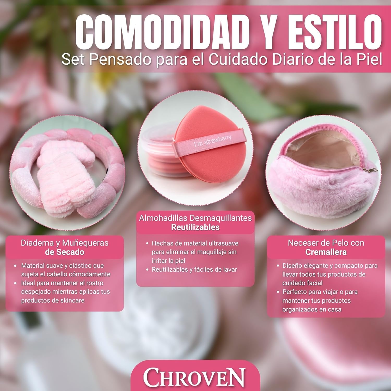 🌸 COMPLETE SKINCARE ROUTINE IN ONE LUXURY SET Discover everything you need for glowing skin: from a soft facial brush and massage roller to moisturizing pads, a fluffy headband with wristbands and a handy toiletry bag. Perfect for everyday use or a pampering moment.