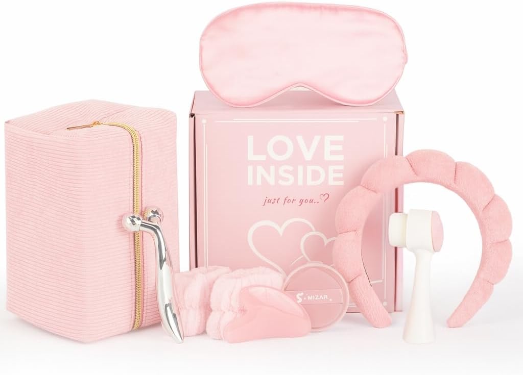 Treat yourself or a loved one with this complete skincare gift set for women – the perfect combination of style, care and relaxation. This luxury beauty box contains everything you need for a daily facial care: a gua sha stone, facial massager, facial brush, reusable makeup remover pads, a fluffy hair band with wristbands, sleep mask, soft toiletry bag and more. Ideal as Mother’s Day gift, Christmas gift for her or birthday gift for women. Whether you suffer from dry, sensitive or combination skin, this set is suitable for all skin types. Each item is selected to gently cleanse, soothe and radiate the skin. Thanks to the environmentally friendly and reusable materials – such as the washable pads and the sustainable design – you are also contributing to a greener world. This skincare set is not only functional but also beautifully packaged. It is a popular gift among women, girls and even teenagers who want to start with a safe and simple skincare routine. Perfect as a gift for mum, grandma, girlfriend or teacher gift. Also ideal as part of a gift set for women, Christmas gift women or as a surprise for Valentine’s Day. Compact and travel-friendly: Take your beauty tools with you in the handy bag to the gym, on a trip or to work. A must-have in every bathroom or beauty collection. Are you looking for an original, stylish and practical gift? This set combines everything in one. Keywords: skincare set women, beauty box, facial care, mother’s day gift set, gift set woman, christmas gift woman, makeup tools, advent calendar beauty 2024, personalized gift, gift for her, rituals gift set alternative, face roller, face mask, makeup remover pads, facial massage, the ordinary glycolic acid, lola cosmetics, preppy skincare.