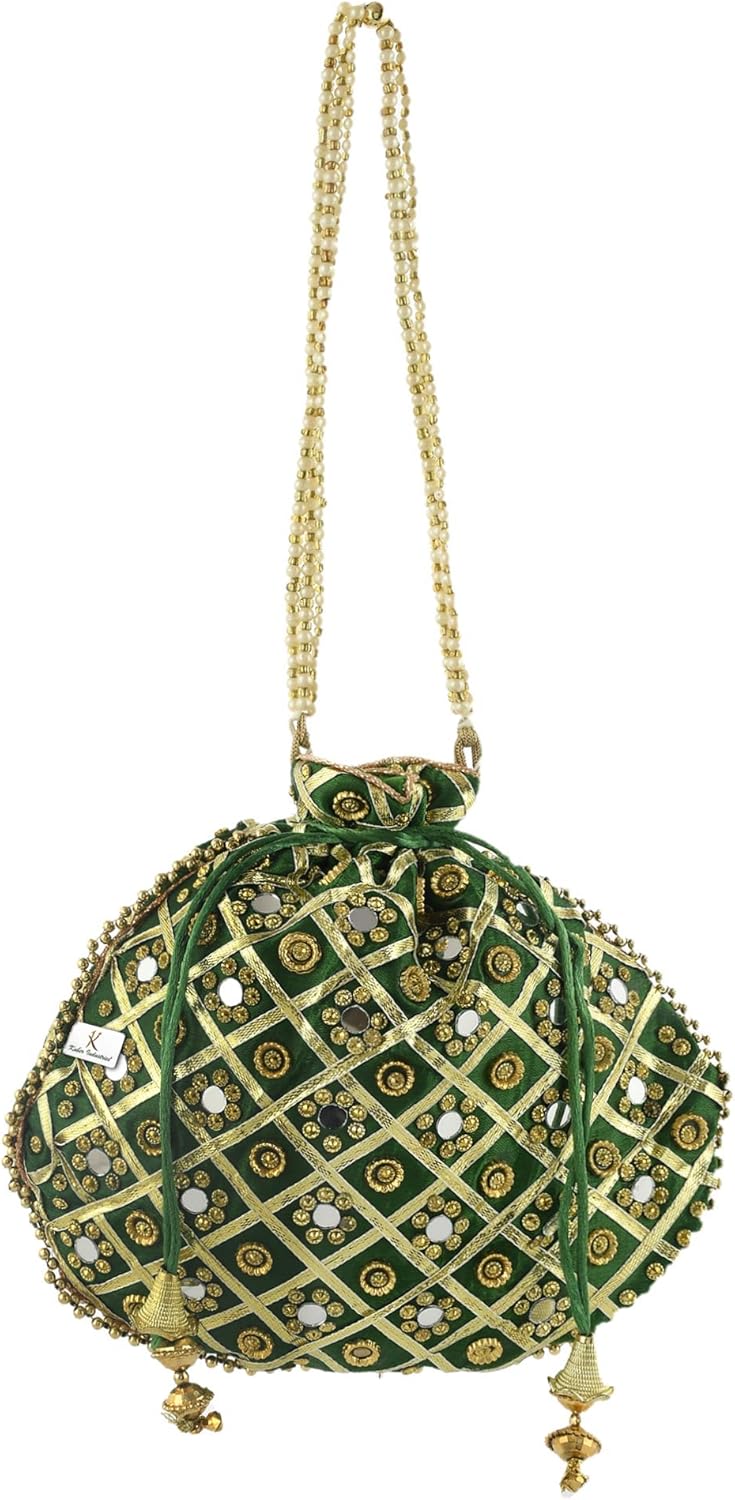 Package Contents: 1 Piece 3-Layer Silk Traditional Mirror Work Clutch Potli Batwa Pouch Hand Bag for Bridal, Casual, Party, Wedding