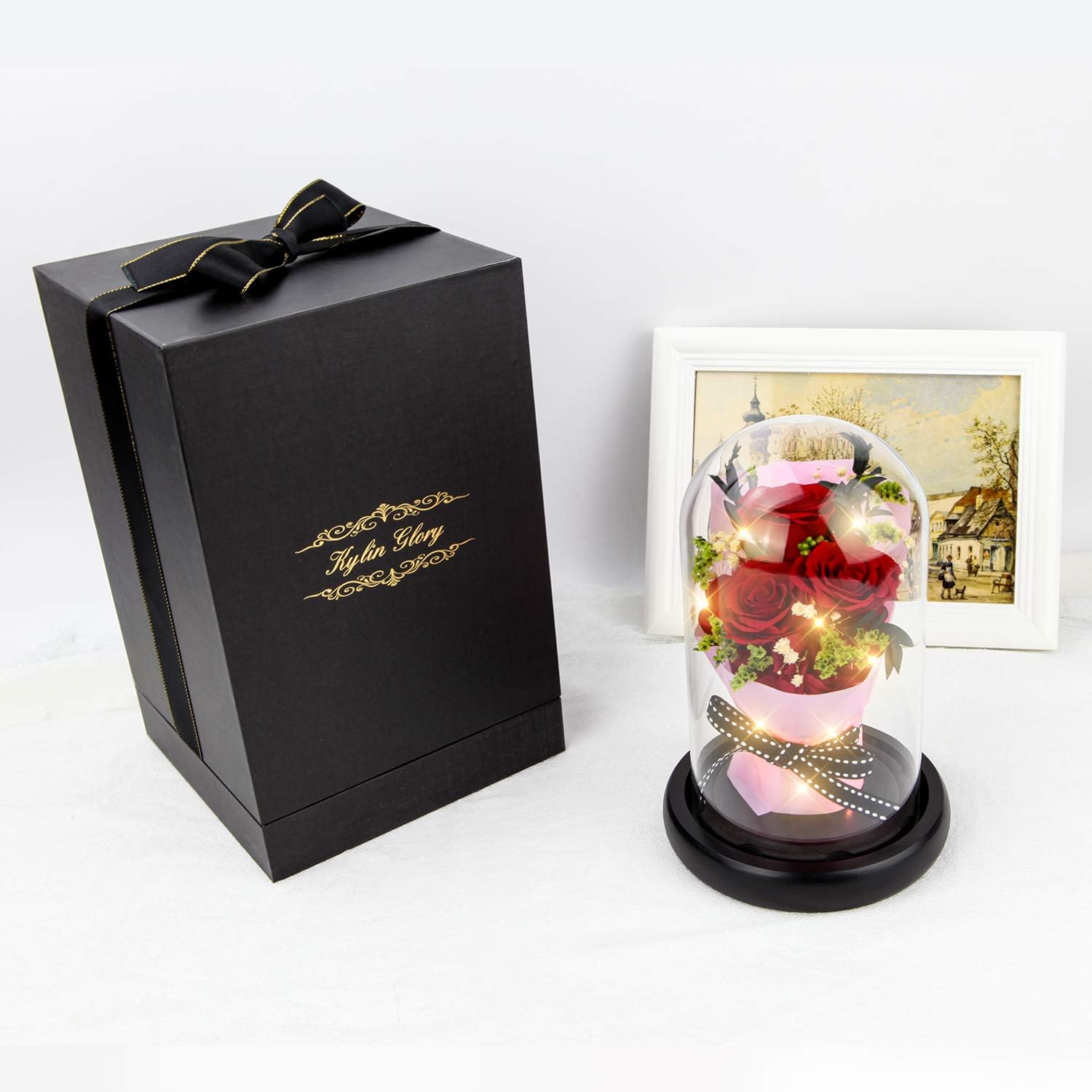 🌹REMOVABLE GLASS DOME: If you want to get a clear picture of the roses inside the glass, our removable glass can do this for you. You can lay a small extra gift like a ring, a card, a picture inside the glass as well to make an ideal surprise to your special one. Besides, transparent glass endows KYLIN GLORY never withered rose with an art of beauty and with indoor decor like living room.
