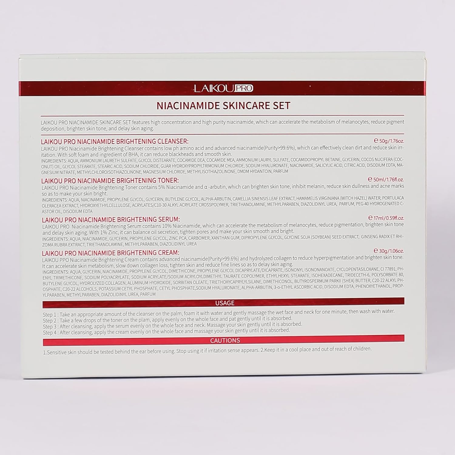 Niacinamide Skincare Set – The LAIKOU Niacinamide Skincare Set includes a cleanser, toner, serum and cream; designed to meet your daily skincare needs while hydrating, balancing, and rejuvenating your skin
