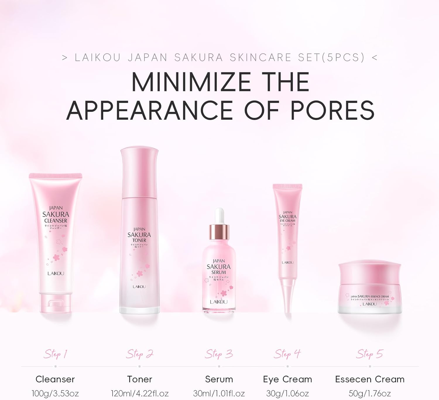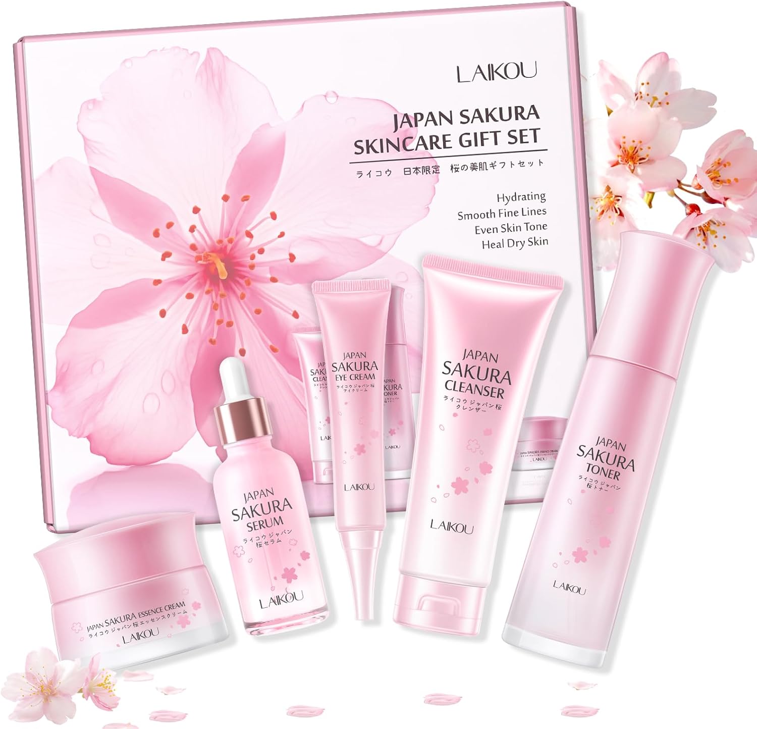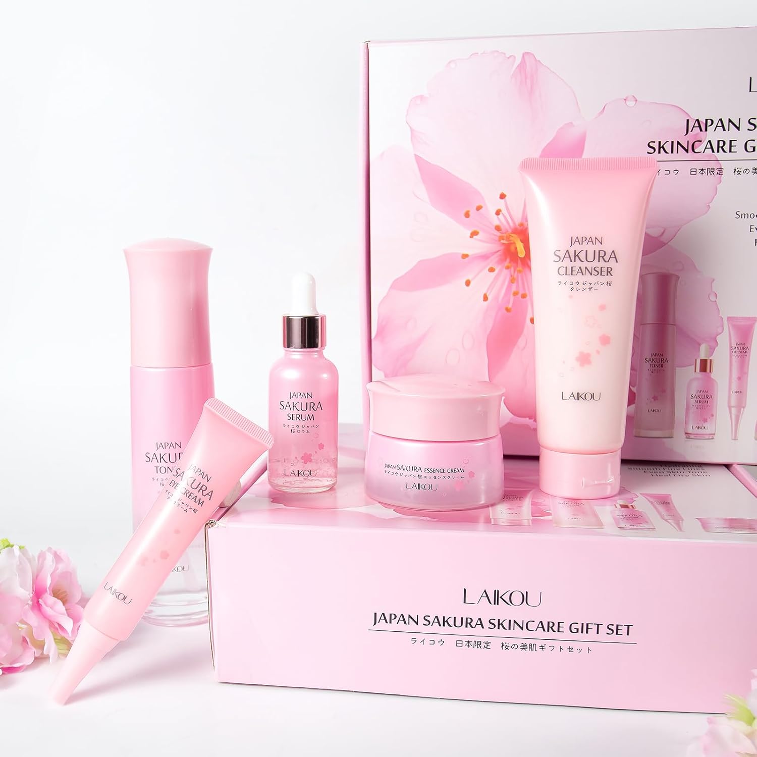 LAIKOU Sakura Skincare Set – 5-Piece Set with Cleanser, Toner, Serum, Eye Cream, and Essence Cream for Hydrating, Smoothing & Even Skin Tone for All Skin Types