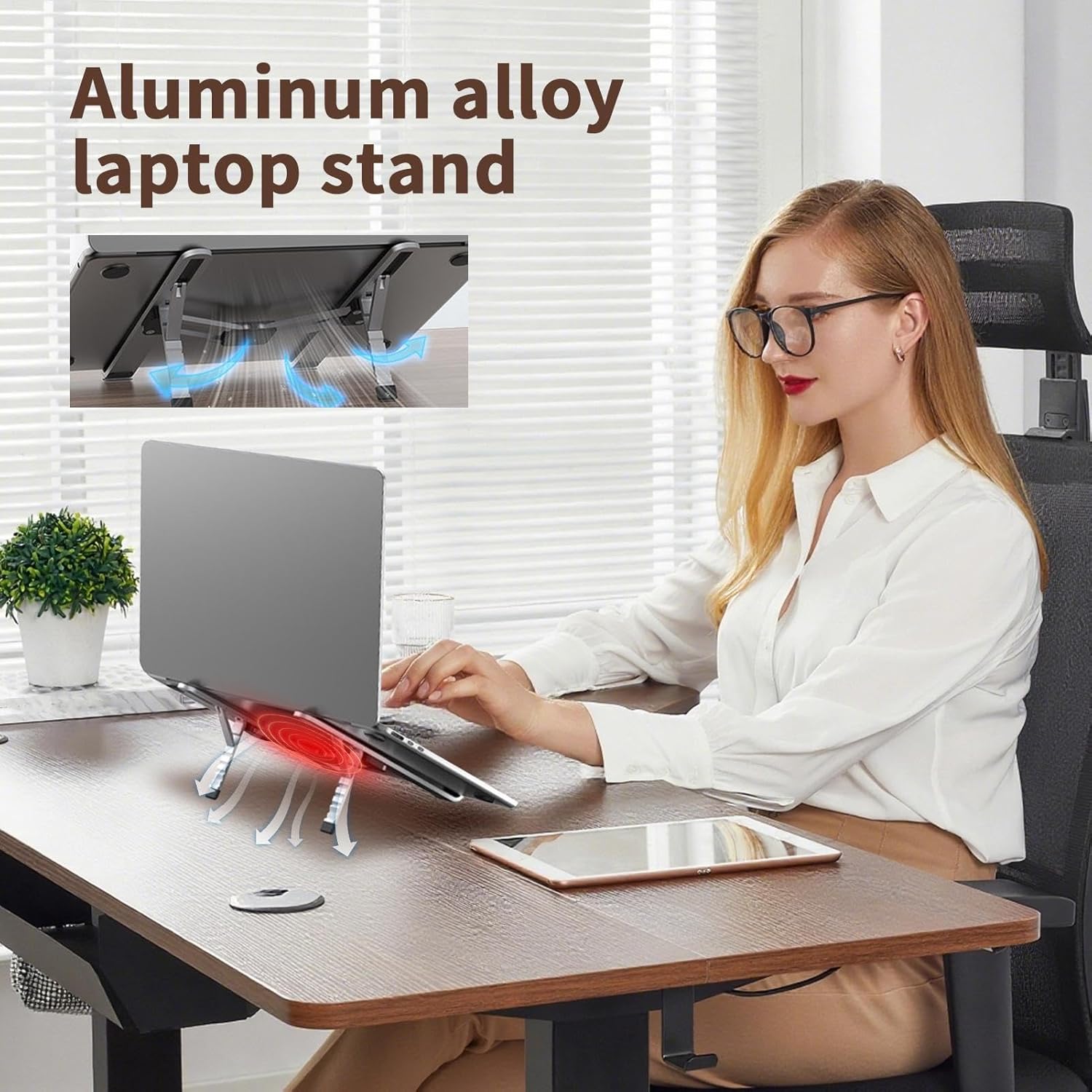 Portable Convenience: With automatic lock stability and a portable foldable design, this laptop stand delivers reliable performance in diverse environments, combining fast-deploy travel-ready ease and slim-profile portability via its advanced integrating hinge folding system
