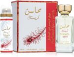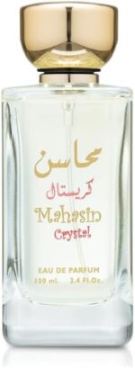 Mahasin Crystal by Lattafa Perfumes is a Floral Woody Musk fragrance for women. Top notes are Apple, Tangerine, Black Currant and Bergamot; middle notes are Freesia, Lily-of-the-Valley, Jasmine and Gardenia; base notes are Vanilla, Sandalwood, Musk and Amber. Set Contents: 3.4 oz Eau de Parfum Spray; 1.7 oz Deodorant Spray;