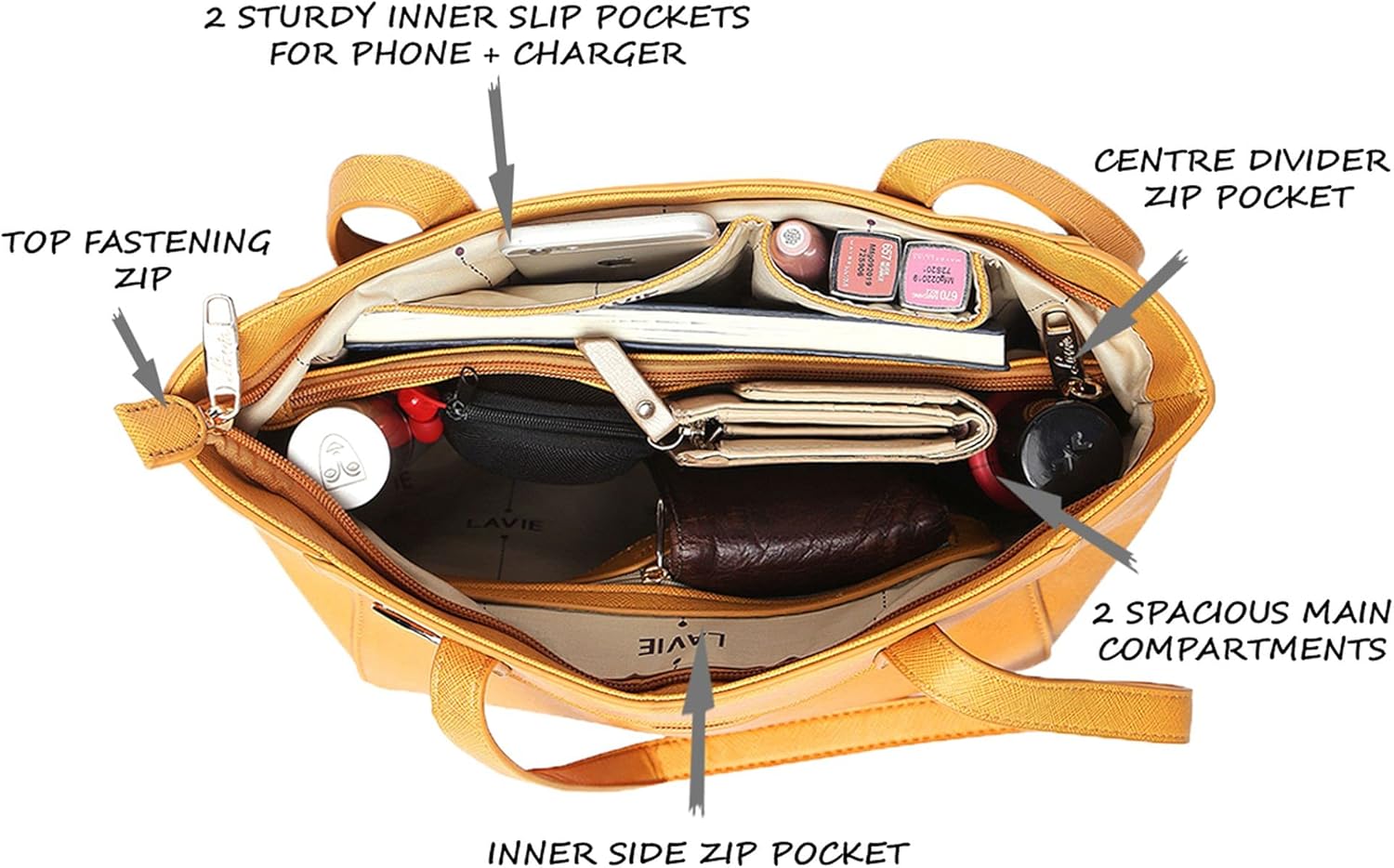 Complete your modish look with this ultra-modern tote bag by Lavie. With multi-utility pockets to organize everyday essentials, and zip closure for convenient security, this piece has been designed to flaunt an alluring appeal. This tote is an ideal example of what today’s fashionista deserves: a blend of trend and substance.