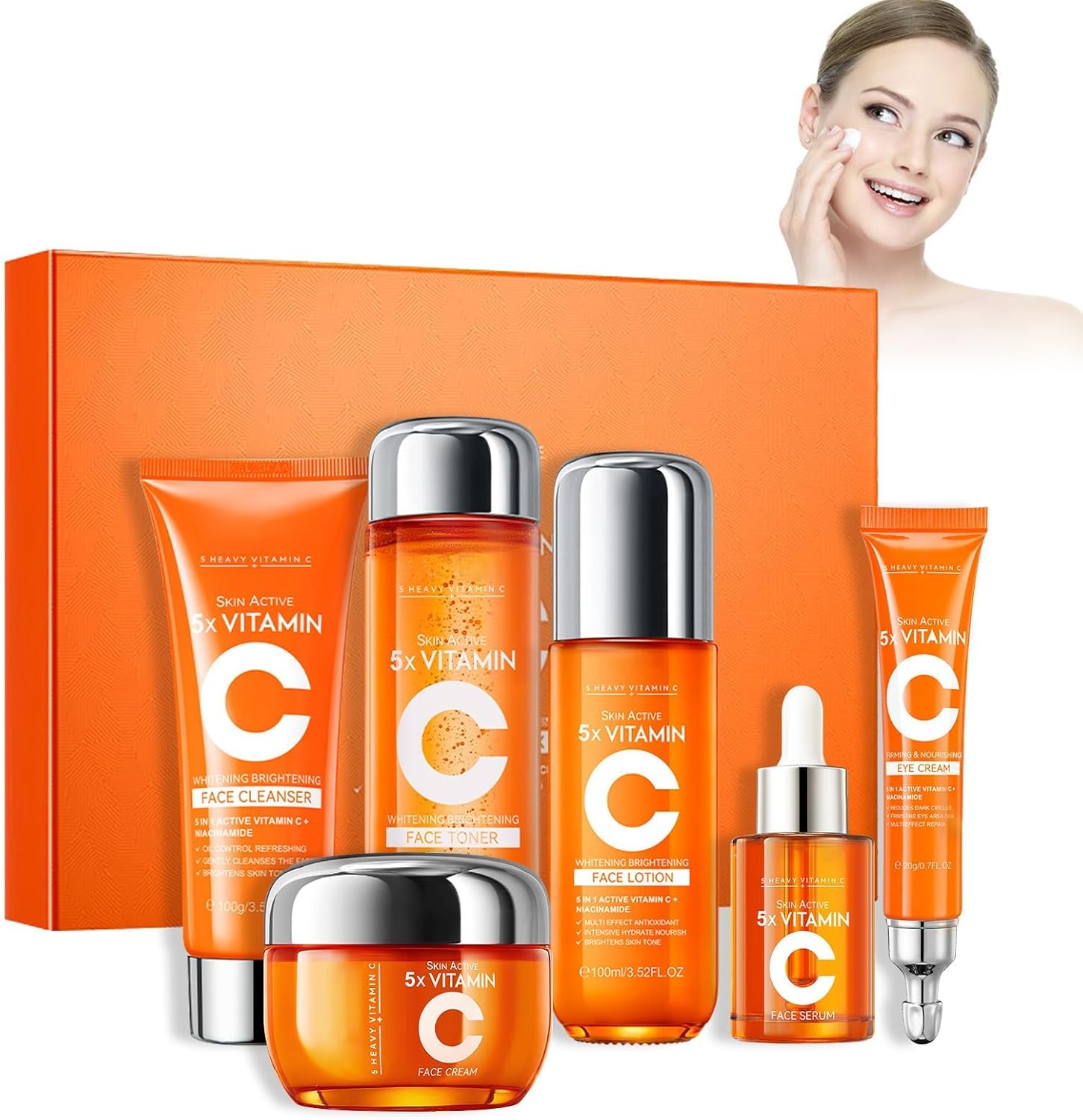 【Complete Skin Care Routine】: This comprehensive set includes a nourishing face toner, serum, cream, lotion,eye cream and cleanser, all infused with 5 heavy vitamin C. Each product works synergistically to improve skin tone, softness, and overall vitality, giving you a complete skincare routine in one convenient package.