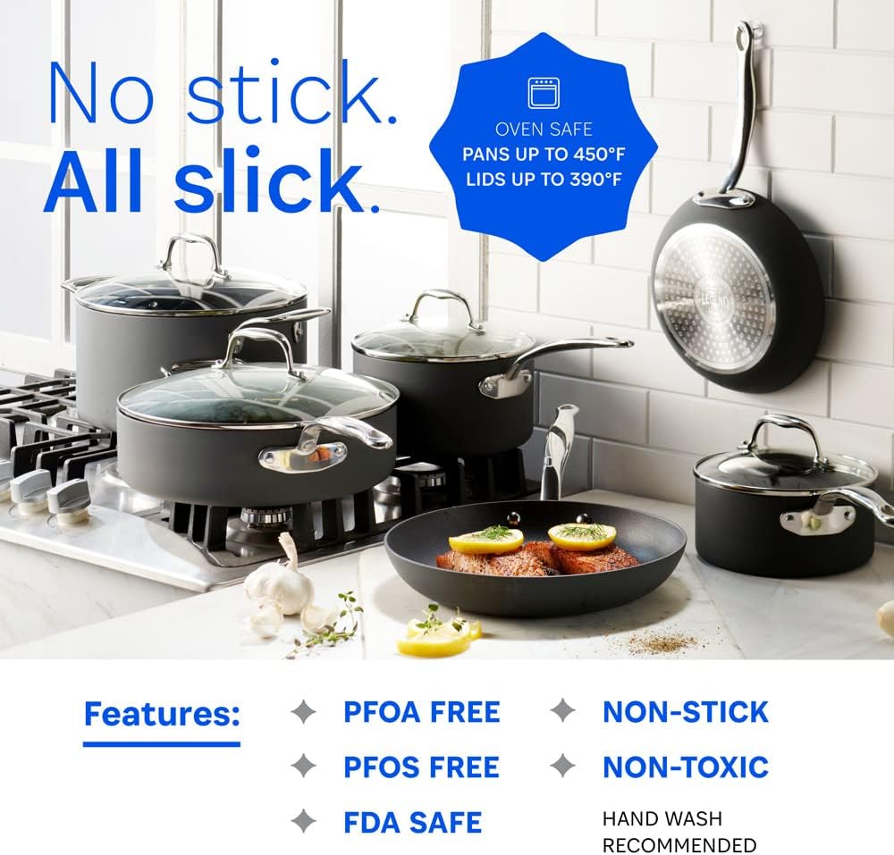 The Slick Hard Anodized Non-Stick Cookware from Legend Cookware is constructed from high quality materials, making this pots and pans set the perfect everyday kitchen workhorses. The hard anodizing process creates a safe nonstick cooking surface. The multi-ply aluminum layers heat up quickly and evenly and retain heat throughout use. Each piece is finished with a durable stainless steel base. Heavy duty, but lighter than cast iron or a total stainless steel cooking set.