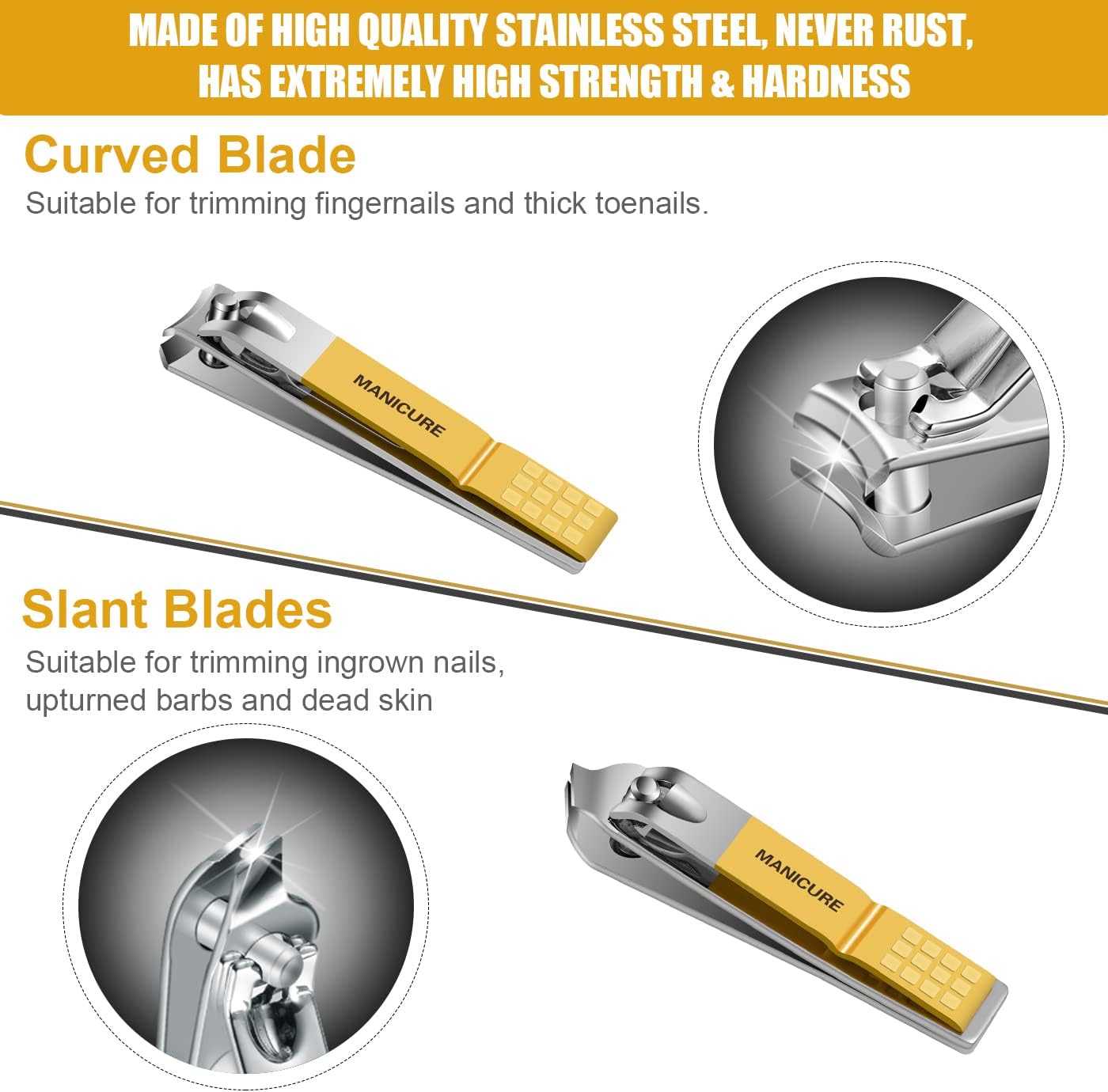 DURABLE & SHARP: We Have Professional and Mature Craftsmanship. All tools are made of high quality stainless steel, and carefully polished. Extremely sharp, high hardness, and will not rust. Thick toenails and even wires can be easily cut off! Curved blade make the edge of nails smooth and not sharp after trimming