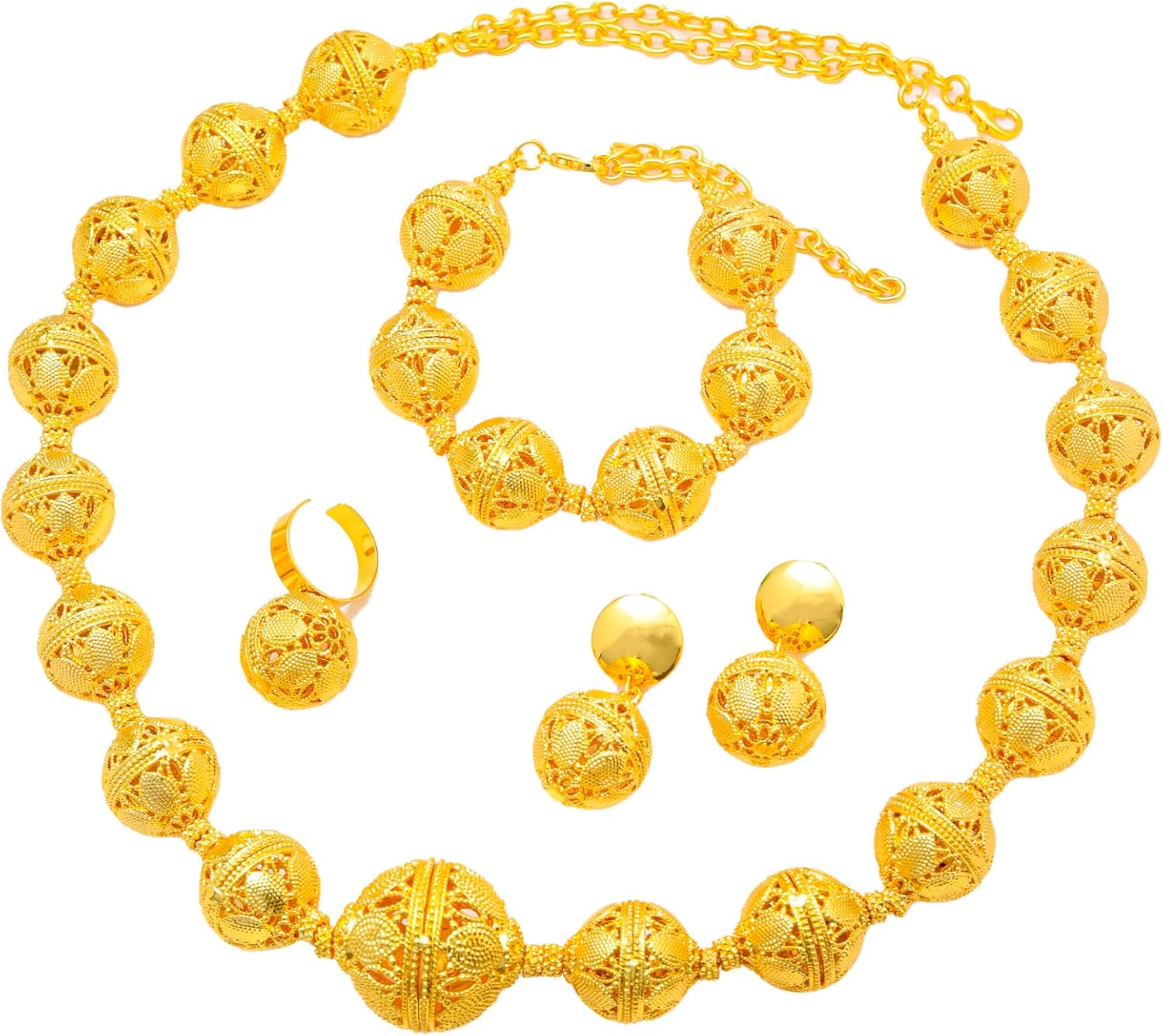 Make a stunning statement with this exquisite gold-plated jewelry set featuring an elegant ball bead design. The set includes a luxurious necklace, matching bracelet, earrings, and ring, all crafted with intricate traditional patterns. Each spherical bead showcases detailed filigree work with a mesh-like texture that catches and reflects light beautifully. The necklace features graduating sizes of beads for added visual interest, while the bracelet continues the same sophisticated motif. The coordinating earrings and adjustable ring complete this glamorous ensemble. Perfect for special occasions, weddings, or cultural celebrations, this set adds a touch of timeless elegance to any outfit. The high-polish finish and substantial feel of the pieces make this set a remarkable addition to your jewelry collection. The secure clasps and durable chain construction ensure comfortable wear, while the versatile design allows you to wear pieces separately or together for maximum impact.