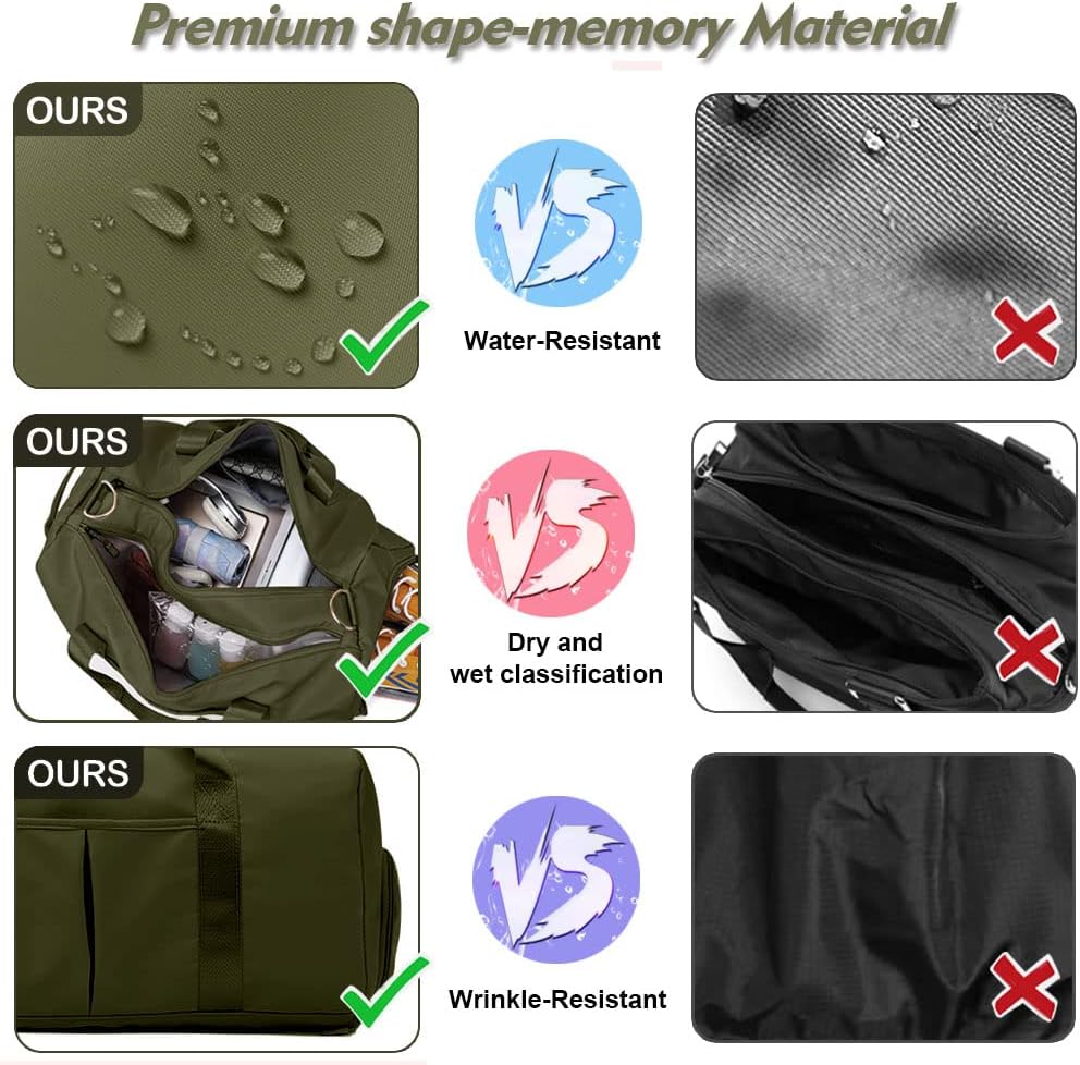 2. Features: The small gym bag has a water-resistant shoe compartment for keeping dirty clothes, shoes and clean stuffs separate.With 1 upgraded waterproof PVC lined pocket inside(7.8 x 17.3 inch), Hidden water-resistant pocket is perfect for storing wet clothes and swimsuits.(Please note that the zipper is not waterproof.)