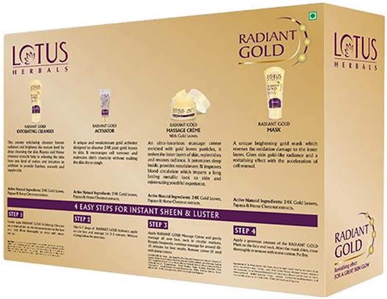 Glow With A Touch Of GoldLotus Herbal Radiant Gold Cellular Glow Facial Kit is just what you need when you want to look spectacular in minutes. This compact, easy-to-use facial kit contains 24K Gold leaves, papaya and horse chestnut extracts which make stimulate cell growth, to revitalize your skin and make it look and feel younger. The gold leaves restore and replenish your skin?s natural glow to make your look enviously radiant in no time! Step 1 | Radiant Gold Exfoliating CleanserThis exfoliating cleanser is boosted with papaya and horse chestnut extracts which gently cleanse your skin off dead cells and remove dirt, grime and excessive oils. The natural astringents in this cleanser soothe, irritated skin and distress it.Step 2| Radiant Gold ActivatorThis activator contains 24Karat Gold Leaves extract which dissolve into your skin and stimulate skin cell renewal to improve skin elasticity without making it rough or dry. This activator tightens and firms your skin making it look younger.Step 3| Radiant Gold Massage Cream With Gold LeavesEnriched with gold leaf particles this massage creams absorbs easily into your skin to revive inner layers of your skin. This helps restore and replenish the natural radiance of your skin. This massage cream penetrates deep into your skin cells to improve blood circulation which imparts a glow to your skin.Step 4| Radiant Gold MaskThis specially formulated mask reverses the effects of oxidation on the layers of your skin and accelerates skin renewal to give you skin which looks healthy & gorgeously radiant.