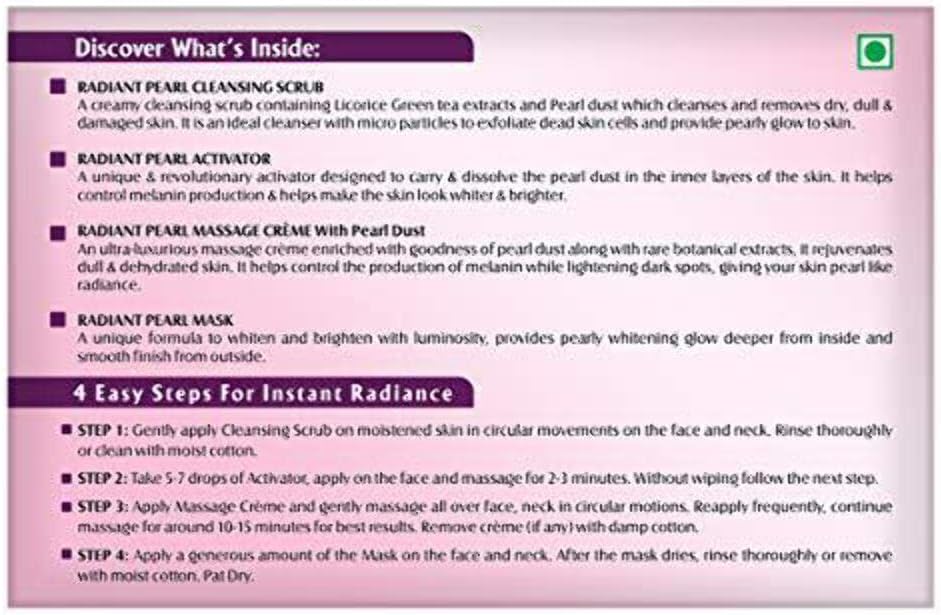 Lotus Herbals Radiant Pearl Facial Kit Contains: One Radiant Pearl Exfoliating Cleanser – This Creamy Exfoliating Cleanser Contains Licorice Green Tea Extracts And Pearl Dust Which Cleanses And Removes Dry, Dull And Damaged Skin, It Is An Ideal Cleanser With Micro Particles To Exfoliate Dead Skin And Provide Pearly Glow To Skin. One Radiant Pearl Activator – A Revolutionary Pearl Activator Designed To Dissolve Pearl Dust In Order To Control Melanin Production And Make The Skin Whiter And Brighter. One Radiant Pearl Massage Creme With Pearl Dust – An Ultra Luxurious Massage Creme Enriched With Goodness Of Pearl Dust Along With Rare Botanical Extracts. It Rejuvenates Dull And Dehydrated Skin, Helping To Control The Production Of Melanin While Lightening Dark Spots And Gives Your Skin Pearl Like Radiance. One Radiant Pearl Mask – A Unique Formula To Whiten And Brighten With Luminosity, Provides Pearly Whitening Glow Deeper From Inside And Smooth Finish From Outside Suitable For All Skin Types Box Contains: Radiant Pearl Cleansing Scrub – 10 G X 1 Pc Radiant Pearl Activator – 7 G X 1 Pc Radiant Pearl Massage Cream With Pearl Dust – 10 G X 1 Pc Radiant Pearl Mast – 10 G X 1 Pc.