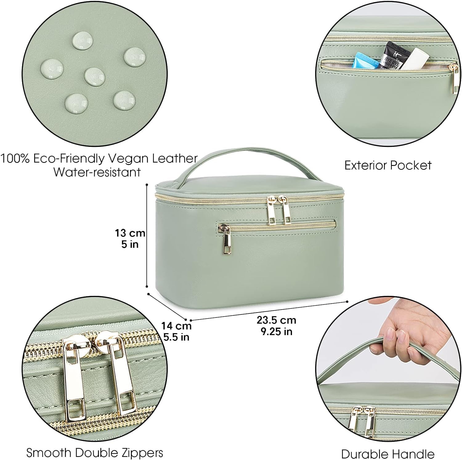Vegan Leather: This premium cosmetic bag is crafted from vegan leather that is soft, water-resistant, and comfortable to the touch. Its well-padded design ensures excellent protection for your makeup and other essentials.