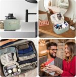 Roomy Interior Organization: The bag features a sturdy top handle and a spacious opening for easy packing and carrying. Inside, there are six elastic cords and three pockets to keep your travel-sized cosmetics and bottles organized. Additionally, there’s a front zipper pocket on the exterior for storing small beauty tools separately and keeping them easily accessible.