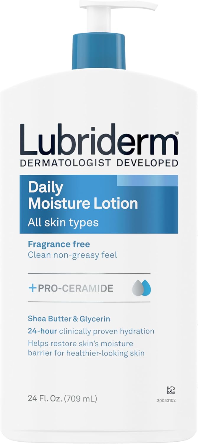 Lubriderm Fragrance Free Daily Moisture Lotion is a moisturizing lotion created by a dermatologist-developed brand and designed to deliver clinically proven 24-hour hydration for healthier-looking skin. Formulated with Pro-Ceramide, shea butter, and glycerin, this lightweight, non-greasy moisturizer helps restore and maintain your skin’s natural moisture barrier, leaving skin soft. The fast-absorbing, unscented formula is allergy- and dermatologist tested, free of parabens, phthalates, and dyes, and will not clog pores, making it ideal for sensitive and normal-to-dry skin. Use this versatile body, face, and hand lotion for women and men as part of your daily skin care routine to help replenish moisture and support a healthy-looking skin barrier. Lubriderm Daily Moisture Lotion is suitable for all skin types, including sensitive skin, and is perfect for those seeking a gentle, fragrance-free moisturizing lotion that provides long-lasting hydration without a greasy feel. To use, smooth on face, hands, and body daily or as directed by a physician. The 24-fluid ounce bottle offers lasting value and convenience for everyday use. Trust Lubriderm, a dermatologist-developed brand, for reliable hydration and gentle care that fits seamlessly into your skin care regimen. With consistent use, this moisturizing lotion helps maintain soft, healthier-looking skin, making it an essential choice for anyone seeking effective, gentle, and fragrance-free hydration for face, hands, and body.