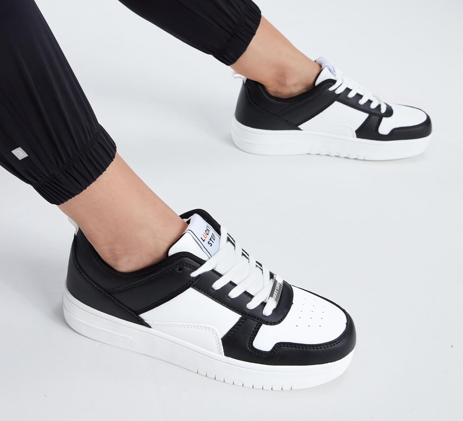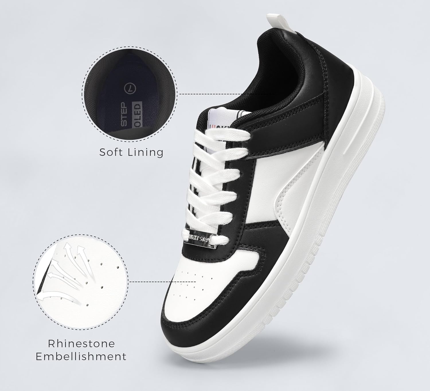 LUCKY STEP Women Fashion Sparkle Rhinestone Sneakers White Leather Low Top Tennis Shoes Lace Up Casual Comfortable Walking Shoe