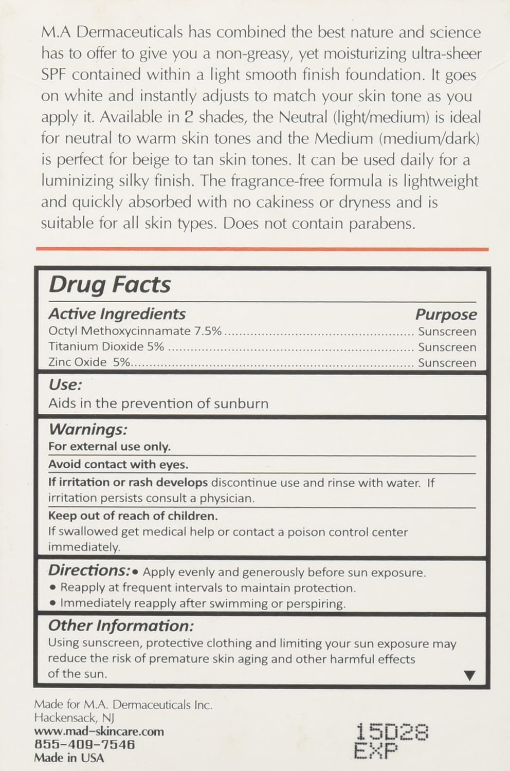 A non-greasy yet moisturizing liquid SPF 50 foundation goes on white and instantly adjust to match your skin tone and naturally adjust Available in 2 shades. The Light is ideal for fair to neutral skin tones and the Medium is perfect for beige to tan skin tones. It can be used daily for an illuminating silky finish. The fragrance -free formula is lightweight and quickly absorbed with no dryness and is suitable for all skin types.
