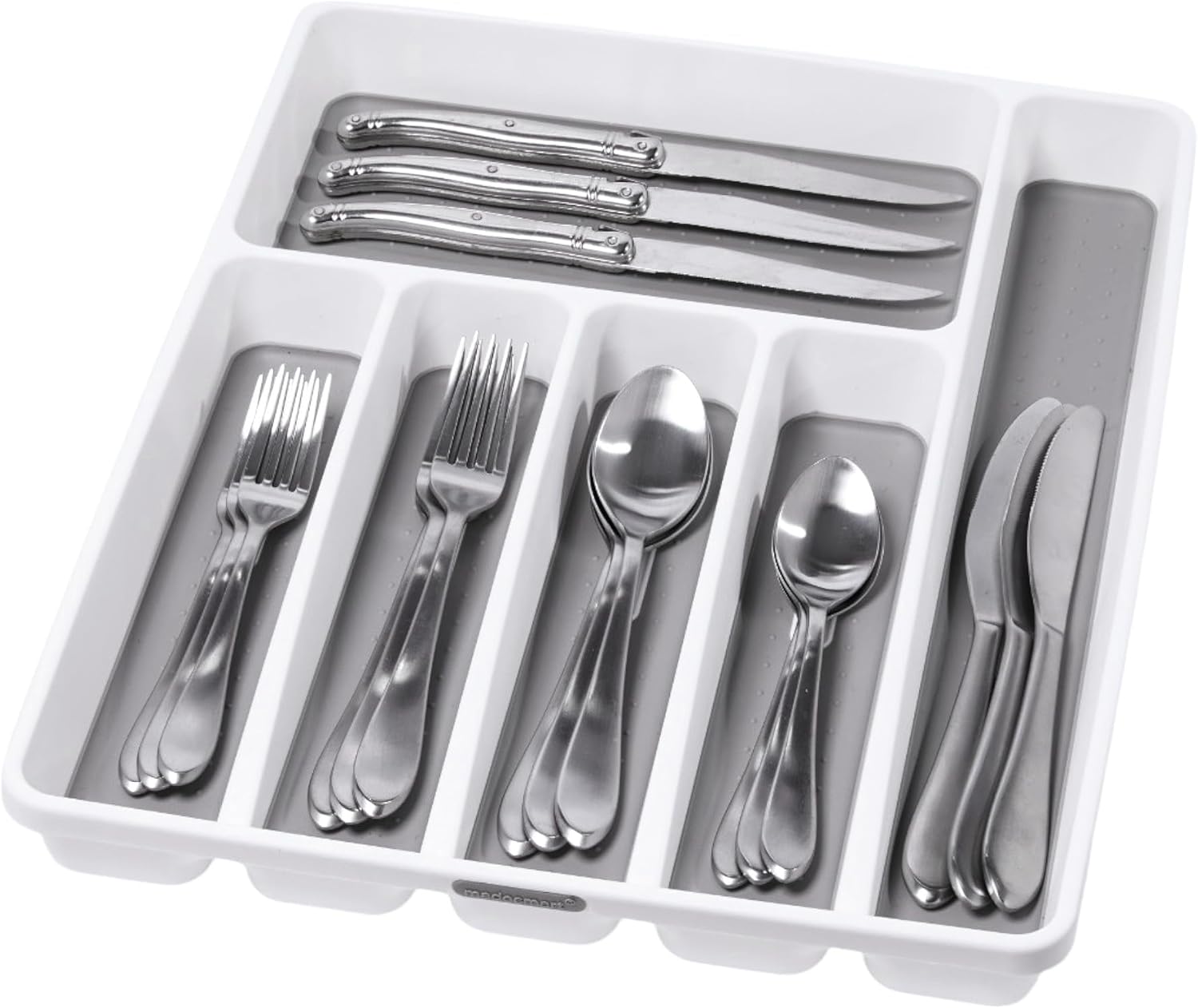 madesmart Antimicrobial Classic Large Silverware Tray Soft Grip, Non-Slip Kitchen Drawer, 6 Compartments, Multi-Purpose Home Organization, EPA Certified, White