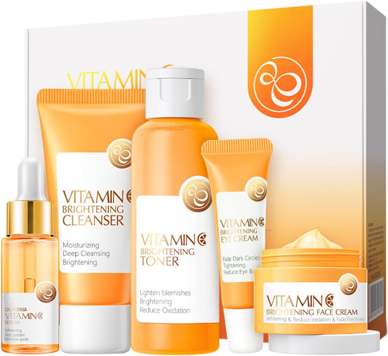 【Skin Care Sets & Kits】The 5 pack Vitamin C skincare set contains our cleanser, face serum, brightening toner,eye cream, essencecream The facial vitamin c essence skin care set can effectively improve dull and dry skin, reduce wrinkles, spots, acne marks, prevent pigmentation,shrink pores, and keep skin moist and shiny for a long time.