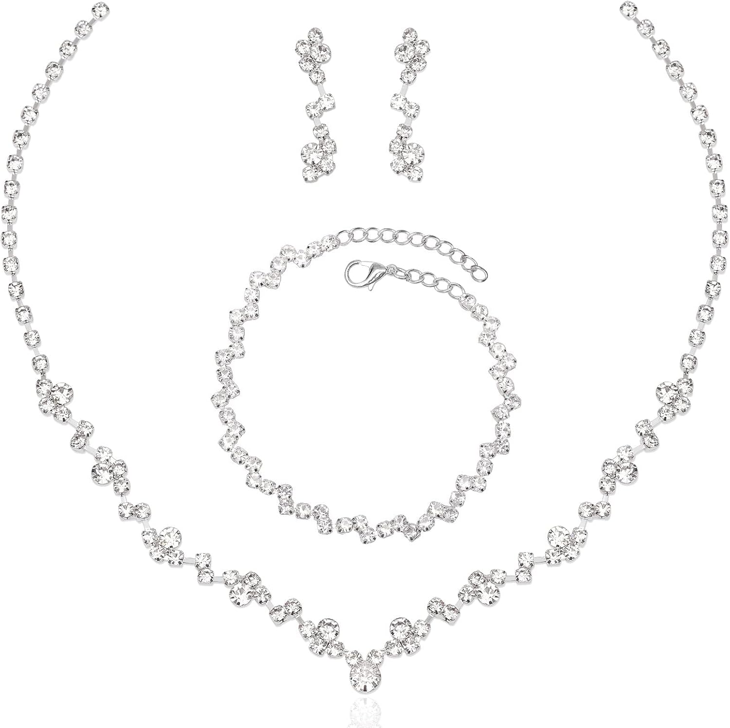 Necklace Earrings Bracelet Set, Crystal Bridal Wedding, Jewelry Sets for Brides Bridesmaid Prom, Costume Accessories for Women (Sliver)