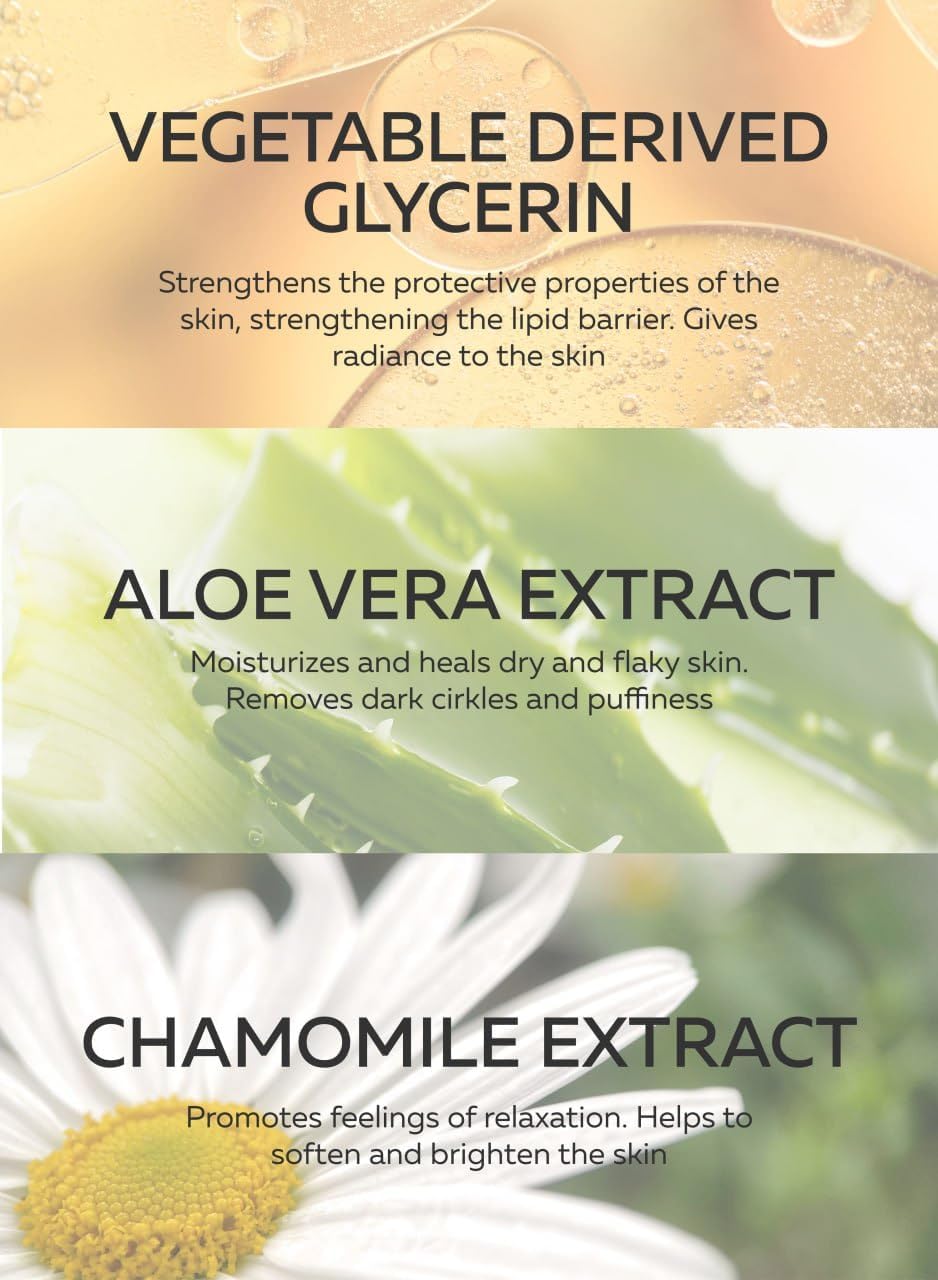 Vegetable-Derived Glycerin – Locks in moisture without clogging pores; gentle and safe for sensitive skin.