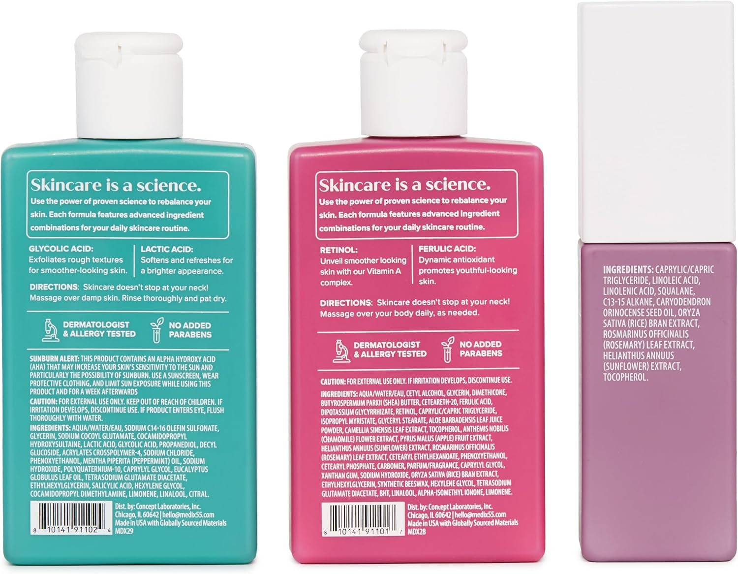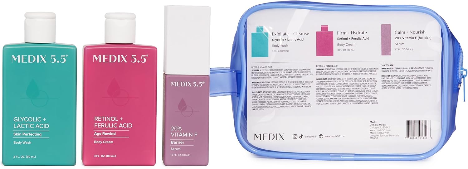 MEDIX 5.5 Best Sellers Travel Kit Skin Care Set – Retinol Body Lotion + Glycolic Acid Exfoliating Body Wash + 20% Vitamin F Body Oil 3PC Skincare Set | Crepey Skin Care Treatment, 3 Piece Travel Kit