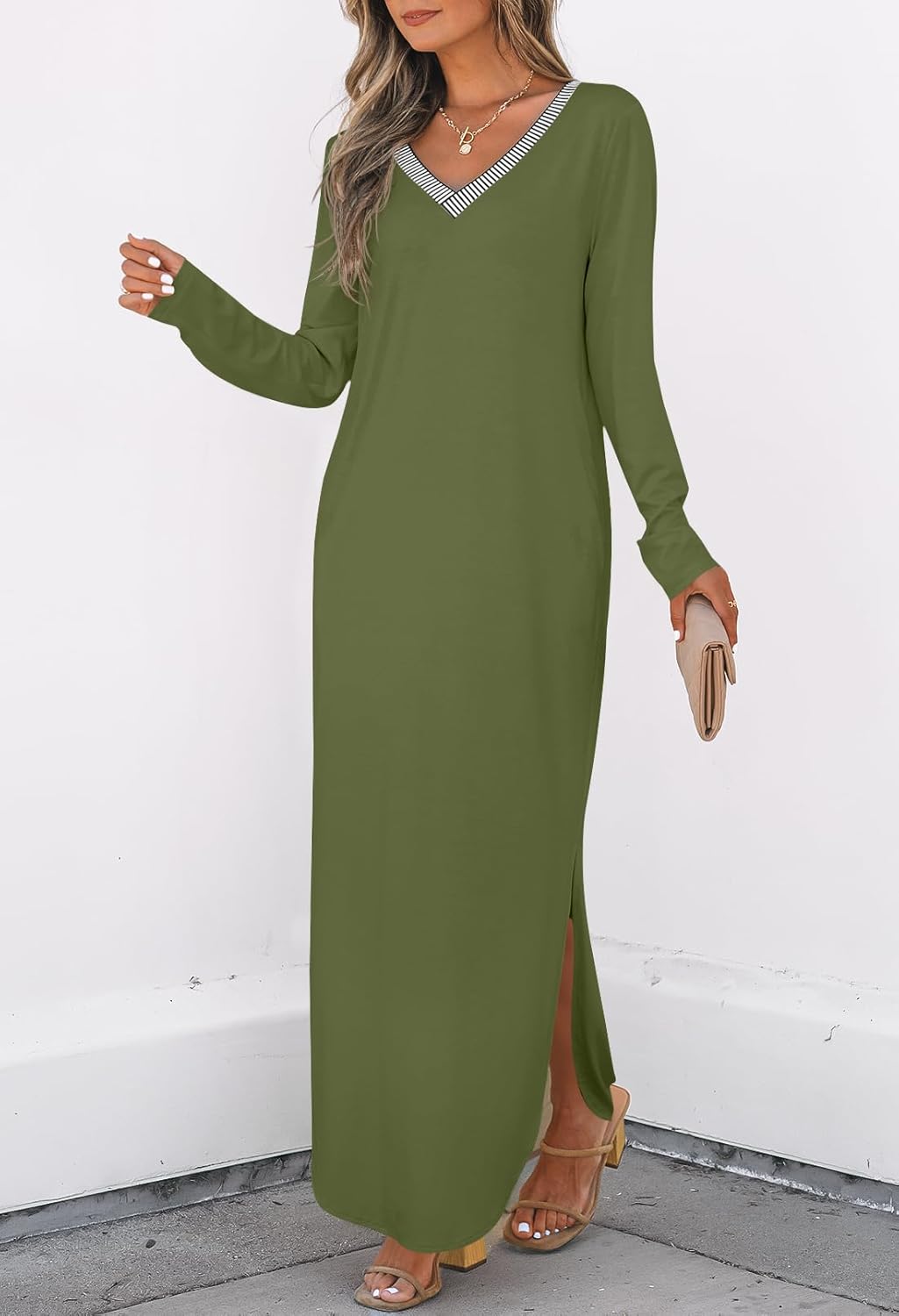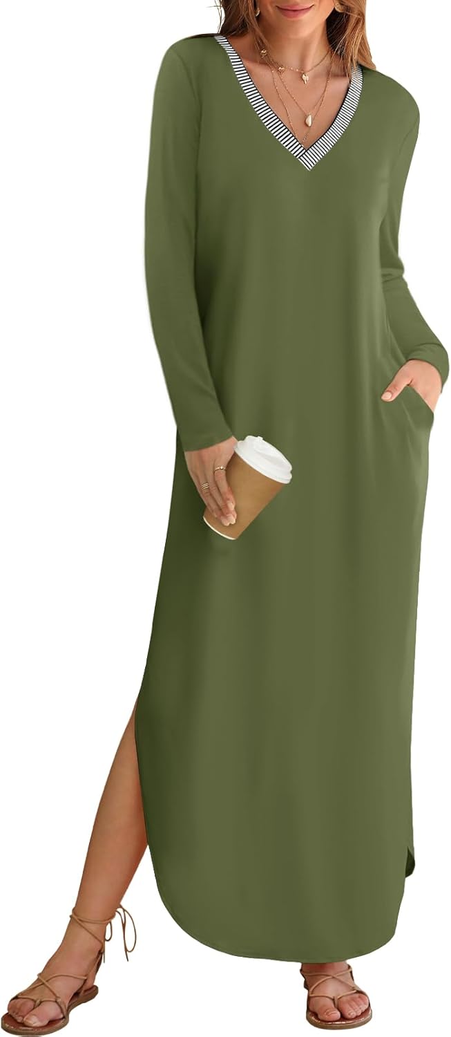Fit: Loose Casual Maxi Dress Features: Long sleeve,v neck, the neckline is same in back as in front, the whole is a solid color and has chic contrast color striped adorn on neckline, two side pockets, side slit, curved hemline, maxi length, loose fit, women’s casual dresses, fall dresses for women 2024.