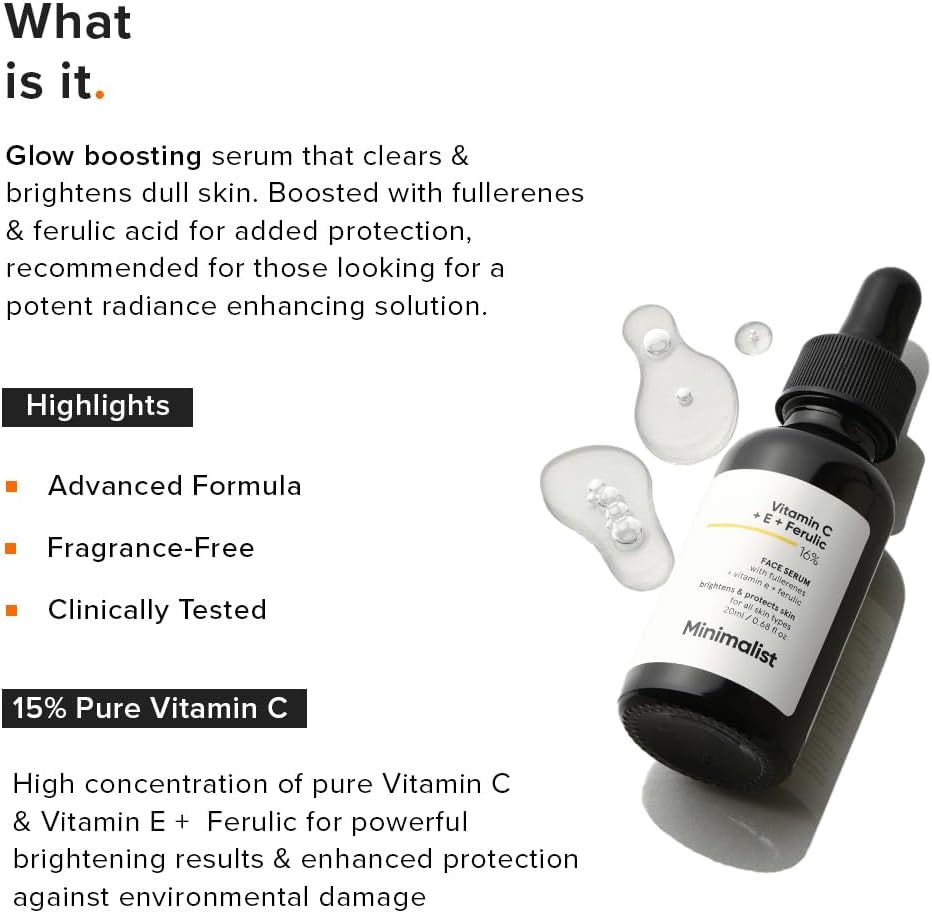Minimalist 16% Vitamin C Face Serum (Advanced) With Vit E, & Ferulic Acid For Glowing Skin | Advanced Brightening Formula With Power of Vit C & E, Ferulic Acid & Fullerenes