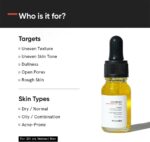Science behind this peeling solution: Unlike physical exfoliators (scrubs, brushes, etc.) commonly used in facials, this gentle yet powerful 32% AHA/PHA/BHA chemical exfoliant trio promotes cell turnover and clear pores without causing micro-tears or damaging the skin’s natural barrier. 25% AHA (Glycolic Acid, Lactic Acid, Mandelic Acid) delivers superficial peeling by dissolving away the dead skin cells present in the upper skin layer, revealing a bright even skin tone. 5% PHA not just exfoliates but also doubles up as humectant and moisturiser. Because of its larger molecule size compared to Glycolic acid (molecular weight 178 vs. 76 for Glycolic acid), it penetrates the skin slowly, hence offering lesser irritation. Lastly, 2% BHA (Salicylic acid) unclog pores by breaking bonds formed by dead cells and flushing out skin debris & oils, reducing blackheads and whiteheads.