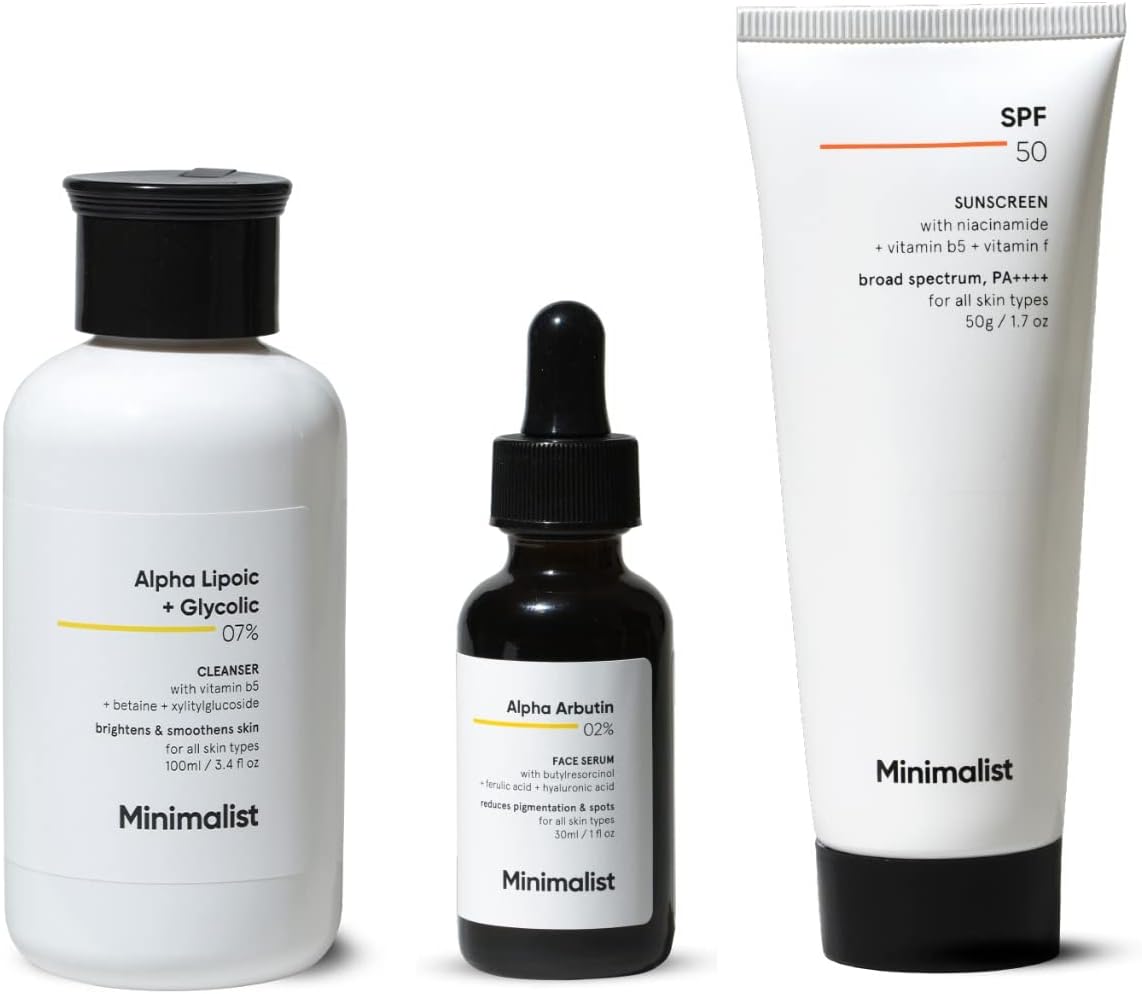 Minimalist Anti-Pigmentation Kit | Skin Care Routine Kit For Women & Men | Face Wash, Serum & SunscreenStart your routine with a daily cleanser consisting of 2 powerful ingredients – Alpha Lipoic Acid & Glycolic Acid in high concentration of 7% to ex