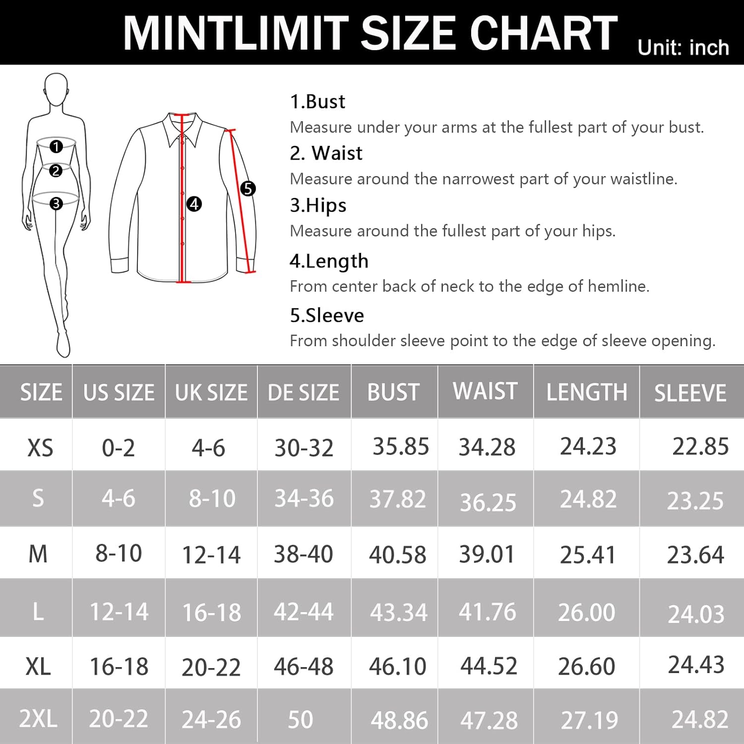 - XS—–Bust 35.83″—–Waist 34.25″—–Sleeve Length 22.83″—–Shoulder 14.07″—–Back center Length 24.21″