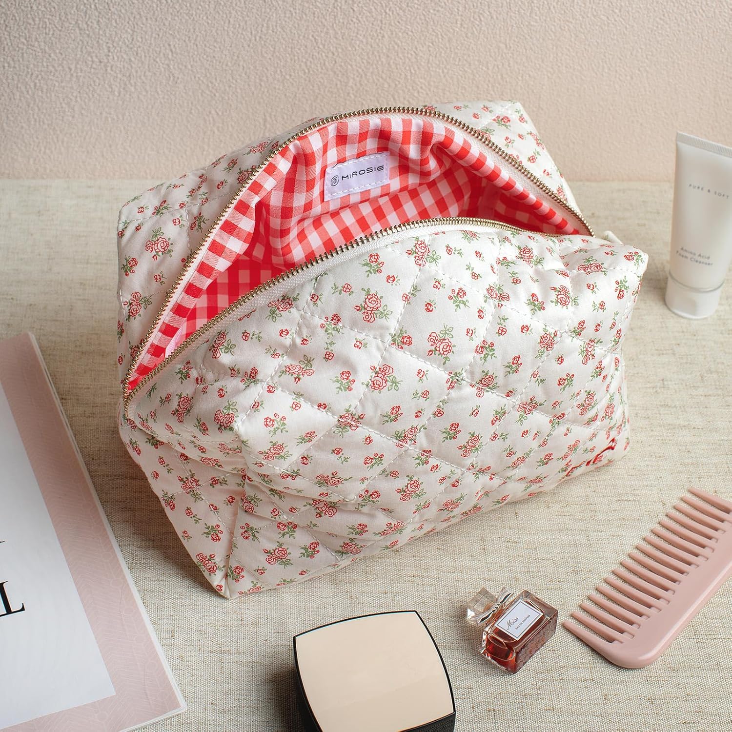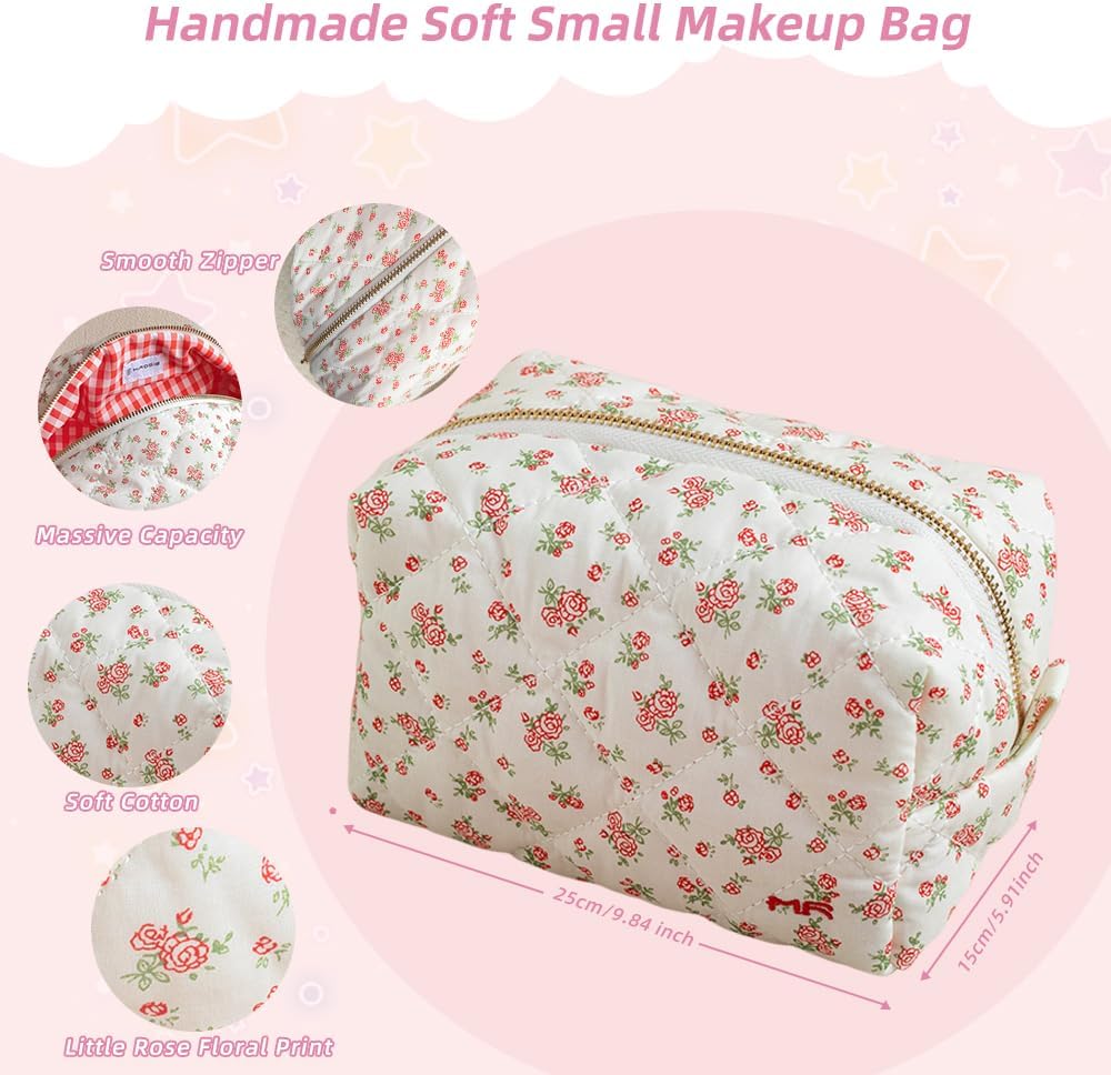 MIROSIE Handmade Cotton Quilted Makeup Bag, Skincare Organizer Zipped Pouch,2 Pieces Floral Beauty Purse for Women Gilrs Skincares Essentials,Travel Cosmetic Bag