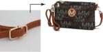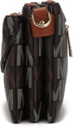 Made of high quality faux leather Fabric lining Luxurious gold tone embellishments Front Tab Studded Milan logo Design Zipper Closures, Velcro Closure. This multiple Compartments Cross body has 5 main compartments, three top Zippered Compartment, One Middle open compartment and One Velcro Closure Compartment. Extra Back Zippered pocket for more space. Wristlet strap 6 in Adjustable/Removable Shoulder strap, 48 in long Measurements: 6in H x 8.5 in W x 5.5 in D