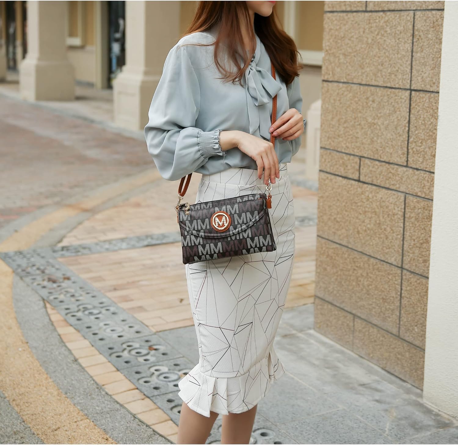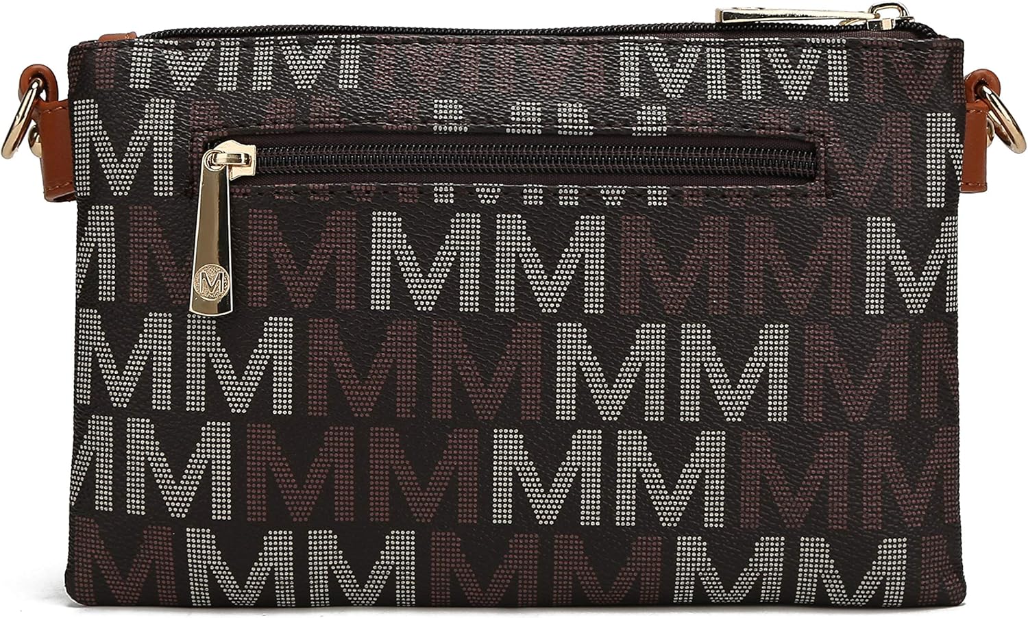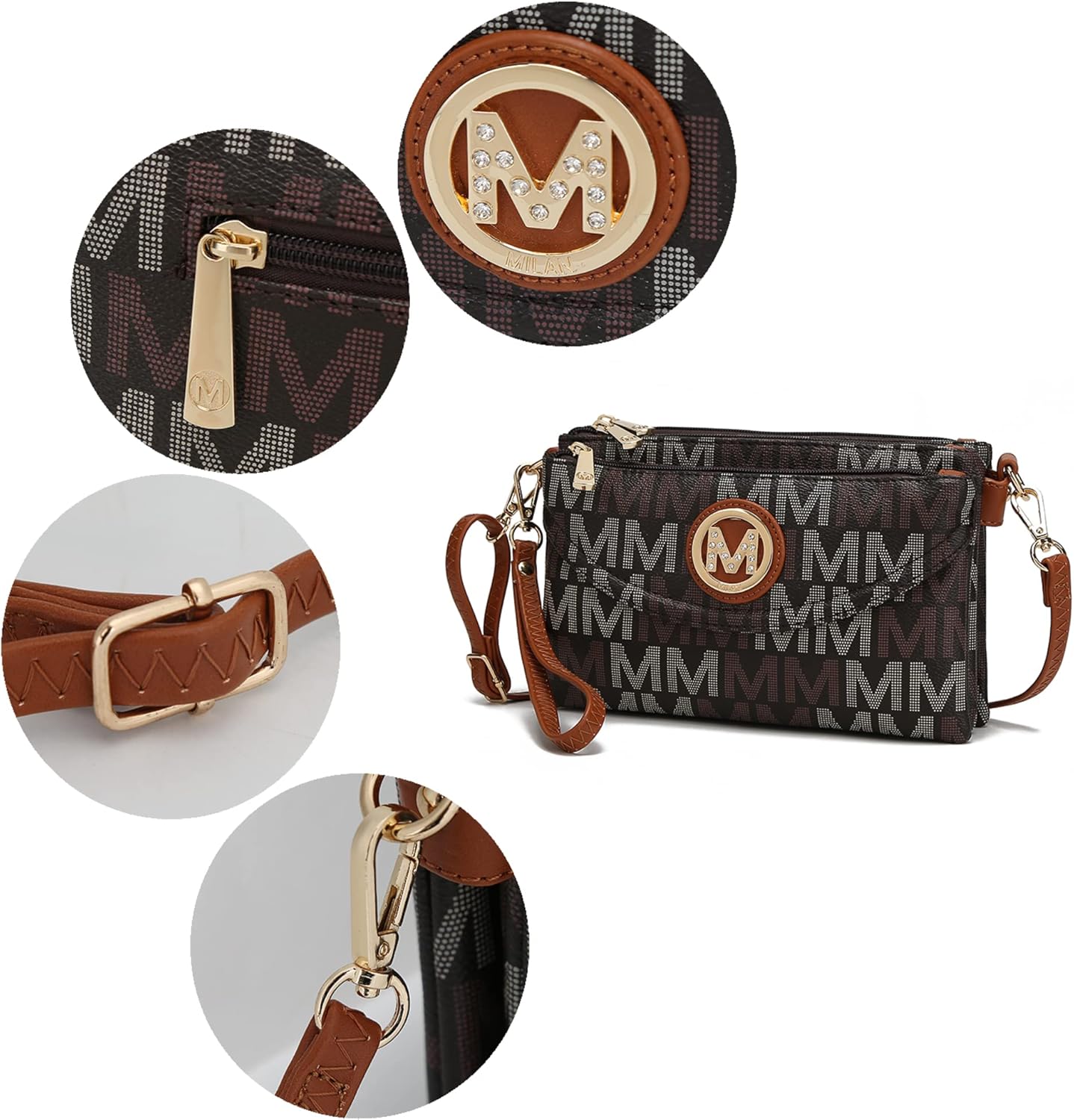 Made of high quality faux leather Fabric lining Luxurious gold tone embellishments Front Tab Studded Milan logo Design Zipper Closures, Velcro Closure. This multiple Compartments Cross body has 5 main compartments, three top Zippered Compartment, One Middle open compartment and One Velcro Closure Compartment. Extra Back Zippered pocket for more space. Wristlet strap 6 in Adjustable/Removable Shoulder strap, 48 in long Measurements: 6in H x 8.5 in W x 5.5 in D