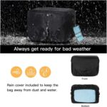 Made with durable canvas and PU leather material. Waterproof rain cover included can fully protect the whole bag from rainwater, keep your belongs not be wet. The PU leather flap cover with inner pad design is simple and stylish, protect your camera from accidental damage and impact. Back trolley belt makes it convenient during the trip, perfectly used for outdoor travel, wedding, photography, vlog.