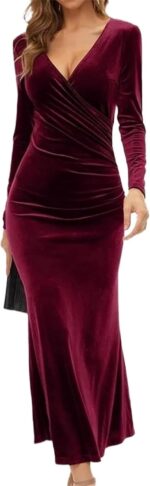 MOTIM Womens Wrap V Neck Long Sleeve Velvet Party Ruched Bodycon Cocktail Party Dress Evening Dress Long Skirt for Lady