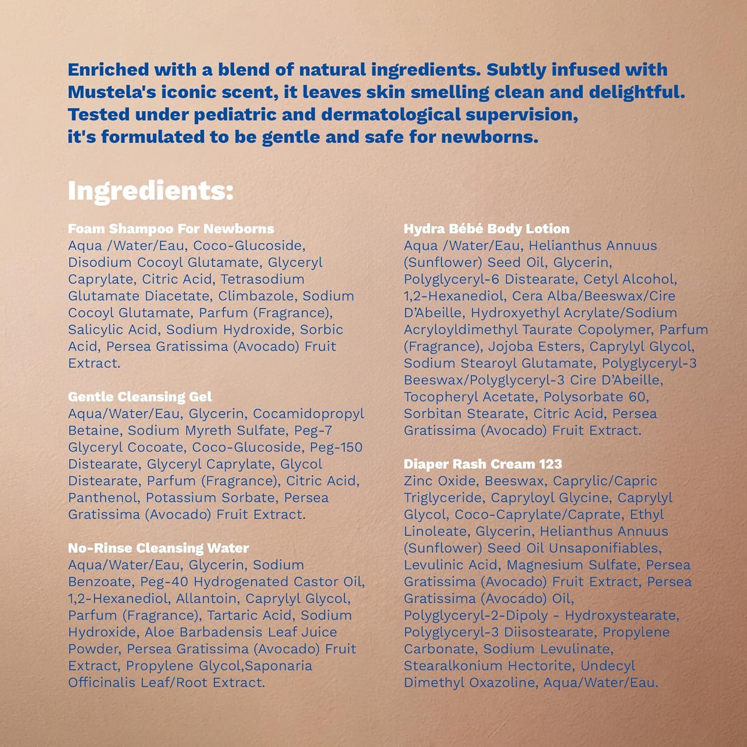 Give newborns soothing head-to-toe skin care with Mustela’s Newborn Arrival Gift Set. Ingredients: AQUA /WATER/EAU, COCO-GLUCOSIDE, DISODIUM COCOYL GLUTAMATE, GLYCERYL CAPRYLATE, CITRIC ACID, TETRASODIUM GLUTAMATE DIACETATE, CLIMBAZOLE, SODIUM COCOYL GLUTAMATE, PARFUM (FRAGRANCE), SALICYLIC ACID, SODIUM HYDROXIDE, SORBIC ACID, PERSEA GRATISSIMA (AVOCADO) FRUIT EXTRACT.