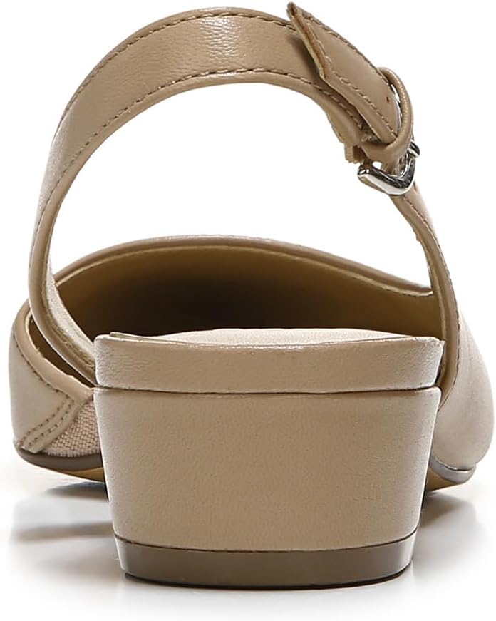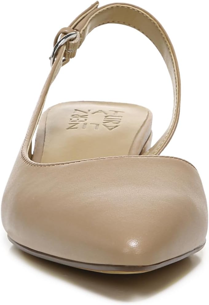 To-the-point. Slip on this elegant and tasteful flat for an extra dash of femininity. Leather, suede or fabric upper. Pointed toe. Sling back strap with buckle closure. N5 contour technology. Non-slip outsole. 1 1/4 inch block heel.