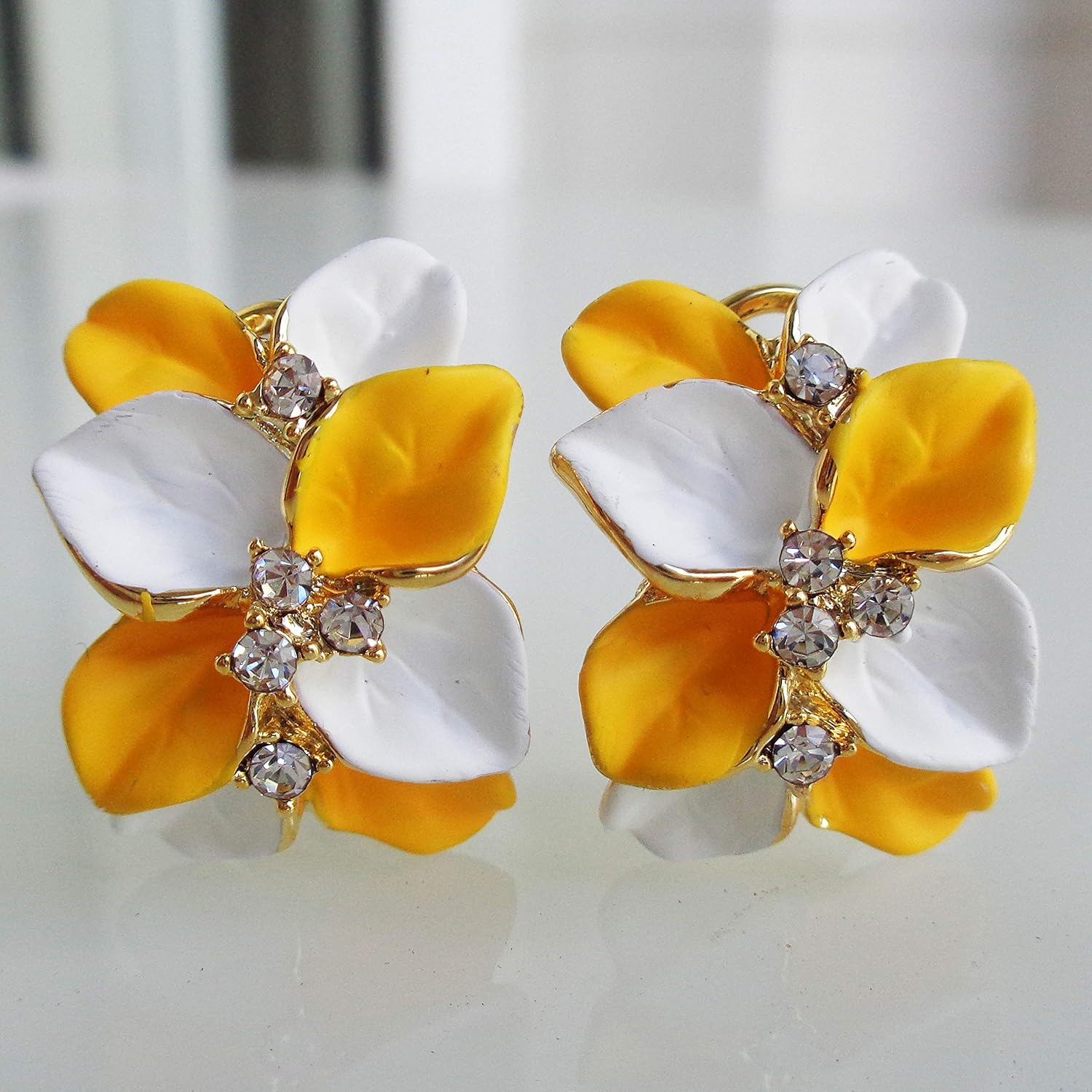 Navachi 18k Gold Plated Crystal Pink Yellow Enamel Leaves Flower Az2008e Omega Earrings