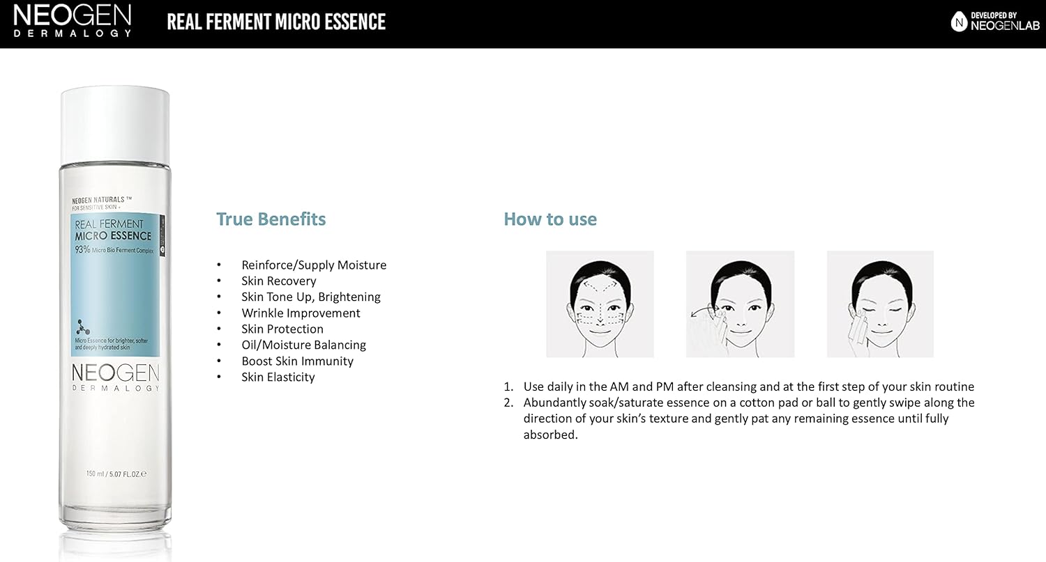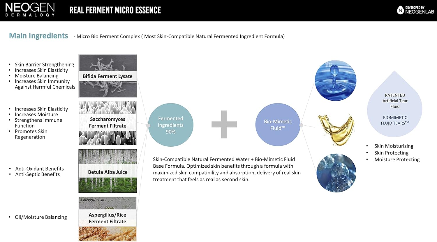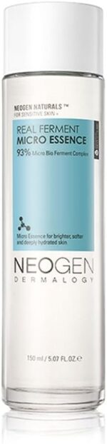Neogen Real Ferment Micro Essence a deeply hydrating and brightening essence that contains more than 93 percent naturally fermented ingredients, including bifida ferment lysate and 28 percent saccharomyces ferment filtrate, to deliver instant moisture and skin-plumping benefits. This fragrance-free fermented treatment is also formulated with 17 percent birch juice to add hydration and 9percent rice extracts to illuminate skin from within. Full of natural brighteners, antioxidants and cell-communicating ingredients, this essence is the key to glowing, supple “honey skin”. To maximize results and benefits use with Micro Serum.