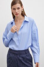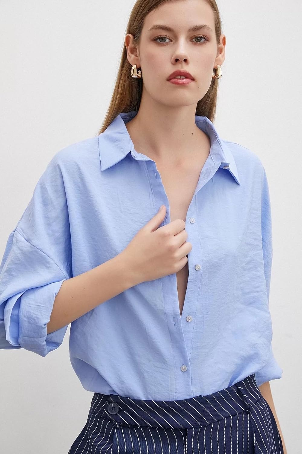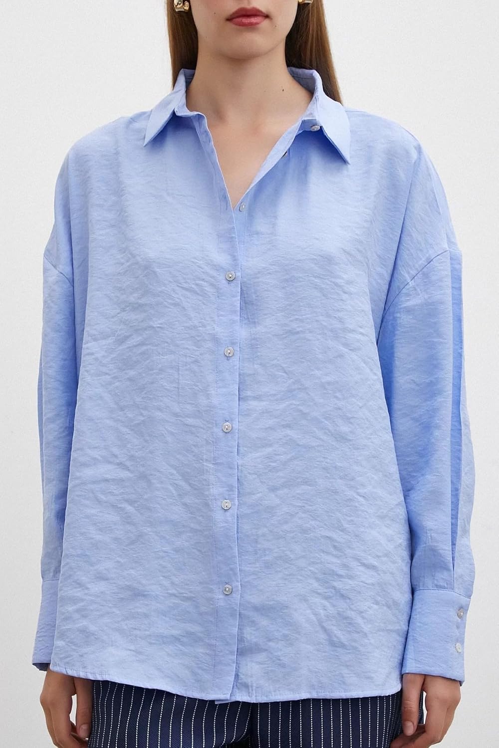 Crafted from soft, breathable modal, this light blue button-down shirt offers a sleek, relaxed fit for all-day comfort. The smooth drape and lightweight feel make it perfect for work, travel, or everyday wear. Long sleeves and a classic collar add timeless elegance to this versatile piece. Model Measurements: Height: 178 cm Chest: 80 cm Waist: 58 cm Hips: 82 cm Weight: 51 Model Size: S · Product Length: 74 cm · Sleeve: 45 cm · Chest: 57 cm · Closure: Button · Weight: 130 · Lining: None · Origin: Turkey